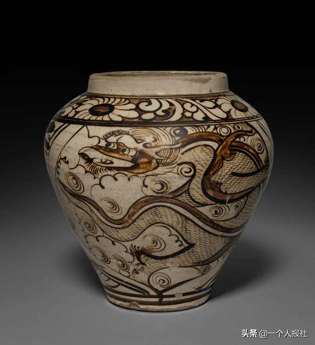 元磁州窑白釉褐彩绘龙纹大罐