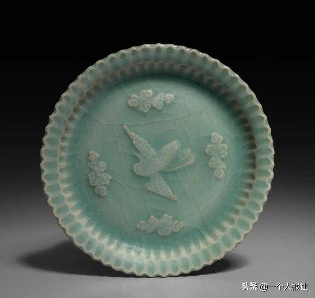 元龙泉窑青釉贴塑云雀纹盘