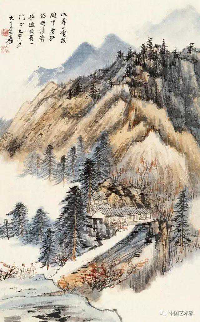 山头是比较亮的色彩,表现的是阳光照在山峰上,下面又表现了云层掩盖下比较暗的山体。画中使用的都是中国颜色,朱砂,石青,石绿,在墨中掺有华青。
