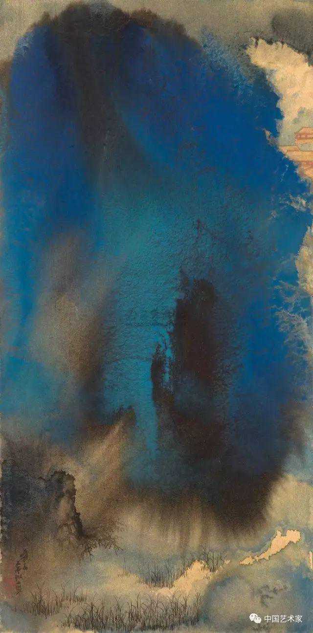 第二天把画室门打开时,只见映在眼中是一团团大墨疙瘩,柔软的宣纸也因水浸而皱缩了起来。张大千不慌不忙地又开始一碗一碗地把石青颜料泼在宣纸上,又关上门,继续风干。