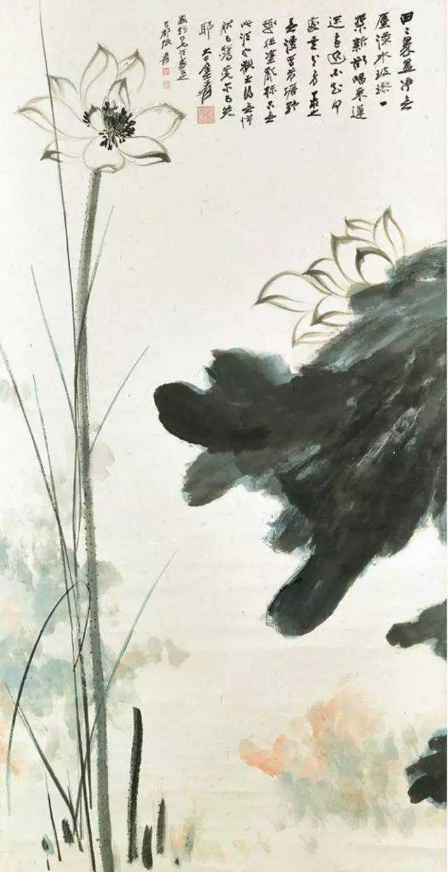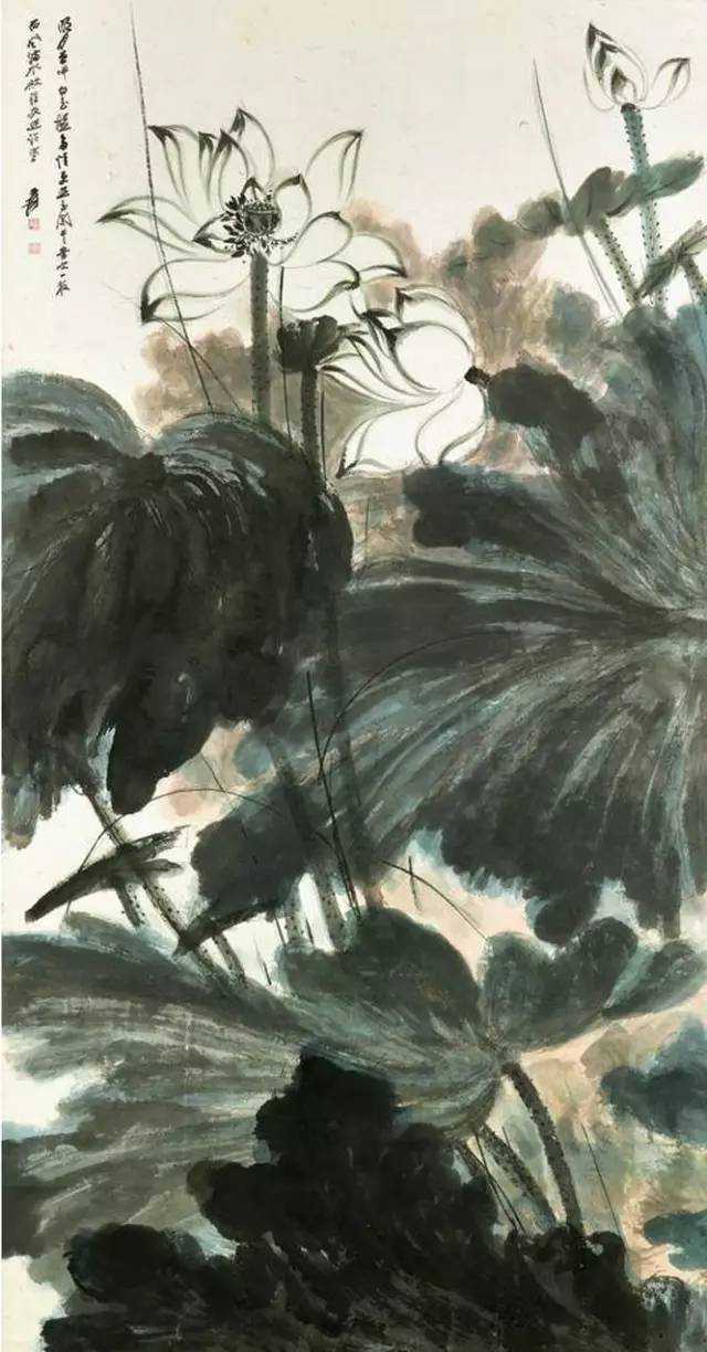 这样一连"泼"了好几天,直到数日后,大千指挥儿子葆萝和弟子们,把宣纸一张一张抬到桌上,然后用笔把每个墨团连接起来,又画出一朵朵的荷花加以点缀,最后将宣纸拼在一起,《巨荷图》成了。