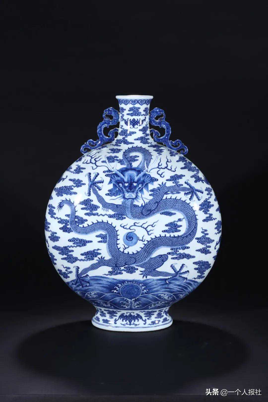 青花海浪福寿云龙抱珠纹双螭龙耳大抱月瓶