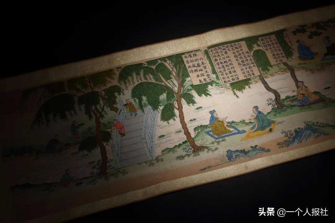 乾隆时期《钦定补刻端石兰亭图帖缂丝全卷》被誉为“缂丝之王”,全卷长约1715厘米,宽约32厘米,共60个人物、9162字,是乾隆帝一生浩瀚“兰亭文化工程”的巅峰之作,也是中国历史上“兰亭”主题的集大成之作。乾隆一生对“兰亭”文化的推崇达到了登峰造极的地步,从69岁刻制“兰亭八柱”到70岁“补刻兰亭图端石”,再到85岁左右织造完成本卷“兰亭图帖缂丝卷”,包括一生创作的10首“兰亭”御制诗——乾隆建立了一项庞大的“兰亭文化工程”。