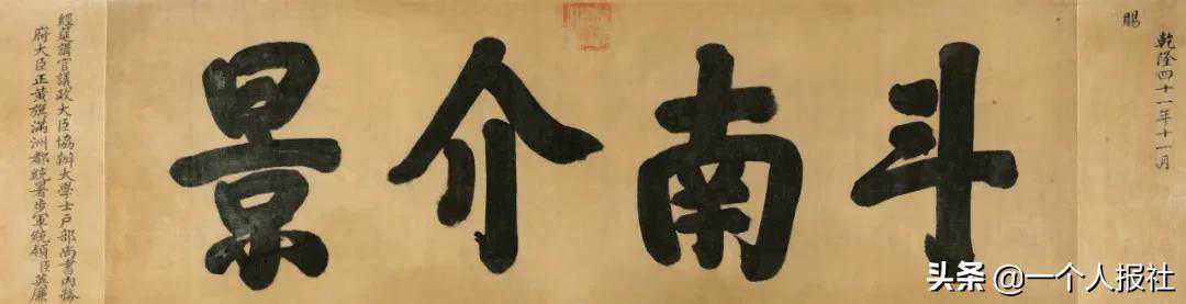 本品为乾隆帝于乾隆四十一年十一月(1776年)榜书准备赏赐给大臣英廉的斗笔榜书大楷匾额的墨迹本。“斗南介景”语出《晋书·天文志上》和《诗·小雅·楚茨》。《晋书·天文志上》有“相一星在北斗南。相者,总领百司而掌邦教,以佐帝王安邦国,集众事也。”旧时因以斗南称宰相的职位。《诗·小雅·楚茨》则有:“以妥以侑,以介景福。”之句,体现了皇帝对于老臣一生政绩的肯定与嘉勉。