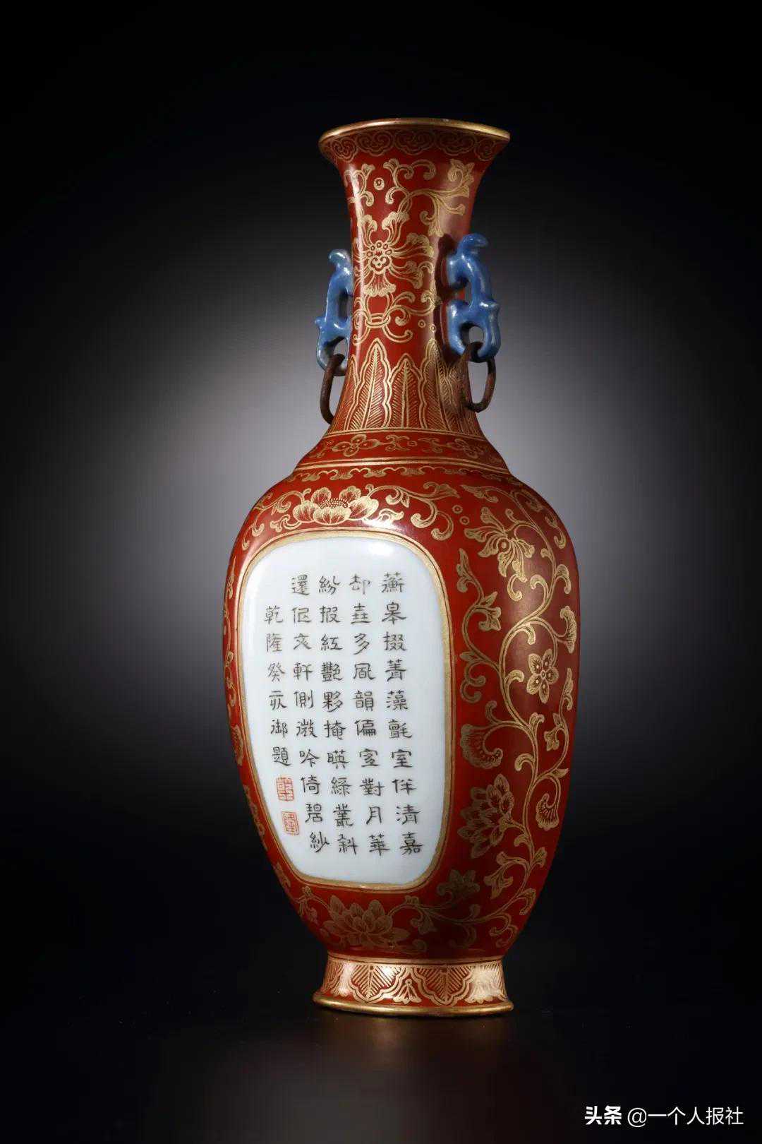 珊瑚红地加金花卉开光御题诗双耳壁瓶清乾隆