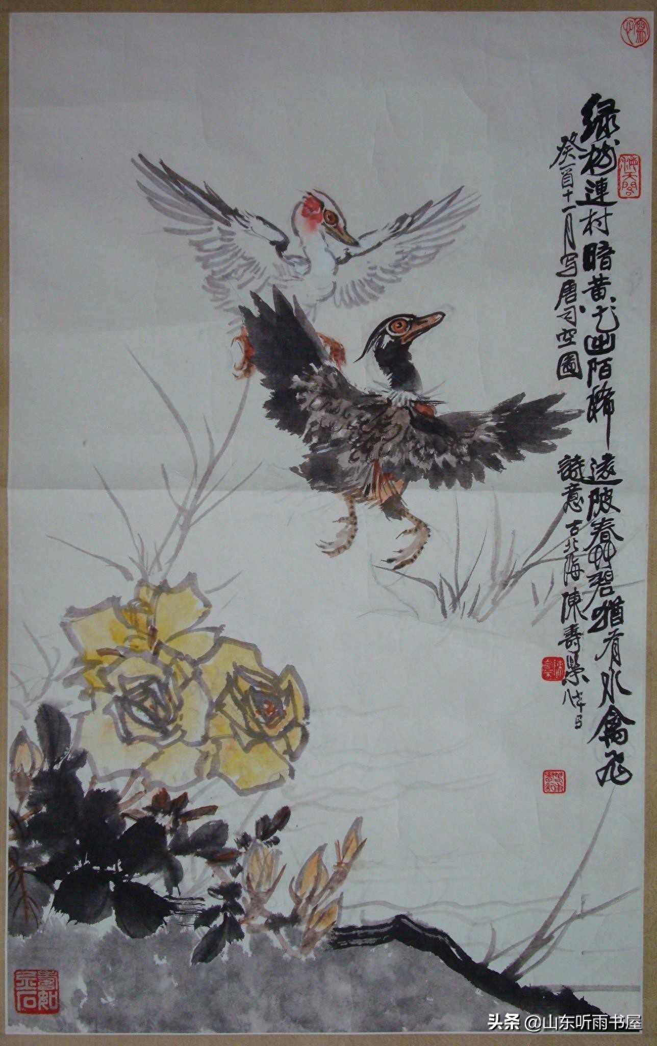 山东潍坊画廊藏品陈寿荣《水禽黄花》。