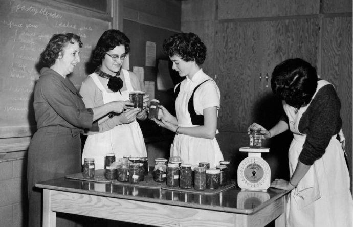 上世纪20至60年代,美国课堂上学习家政课的女生,当时只有女生需要学习如何做家务,烹饪,修理厨房机械,裁缝,照顾婴儿等技能