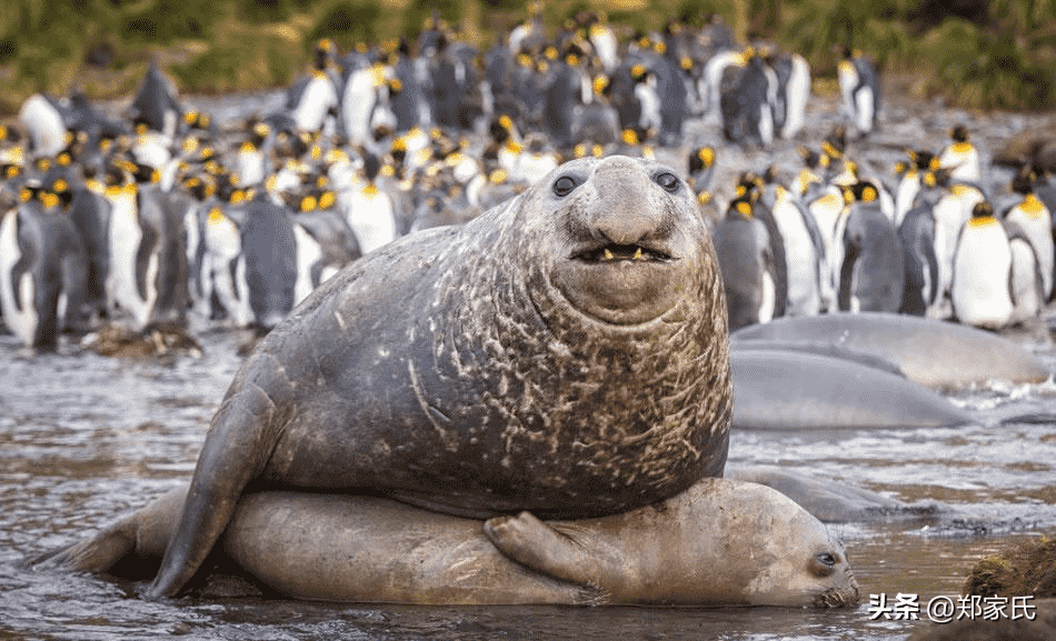 象海豹正在交配,体型壮硕、重达四吨的雄性象海豹像一座山一样粗暴地压在娇小的老婆身上,场面令人忍俊不禁。