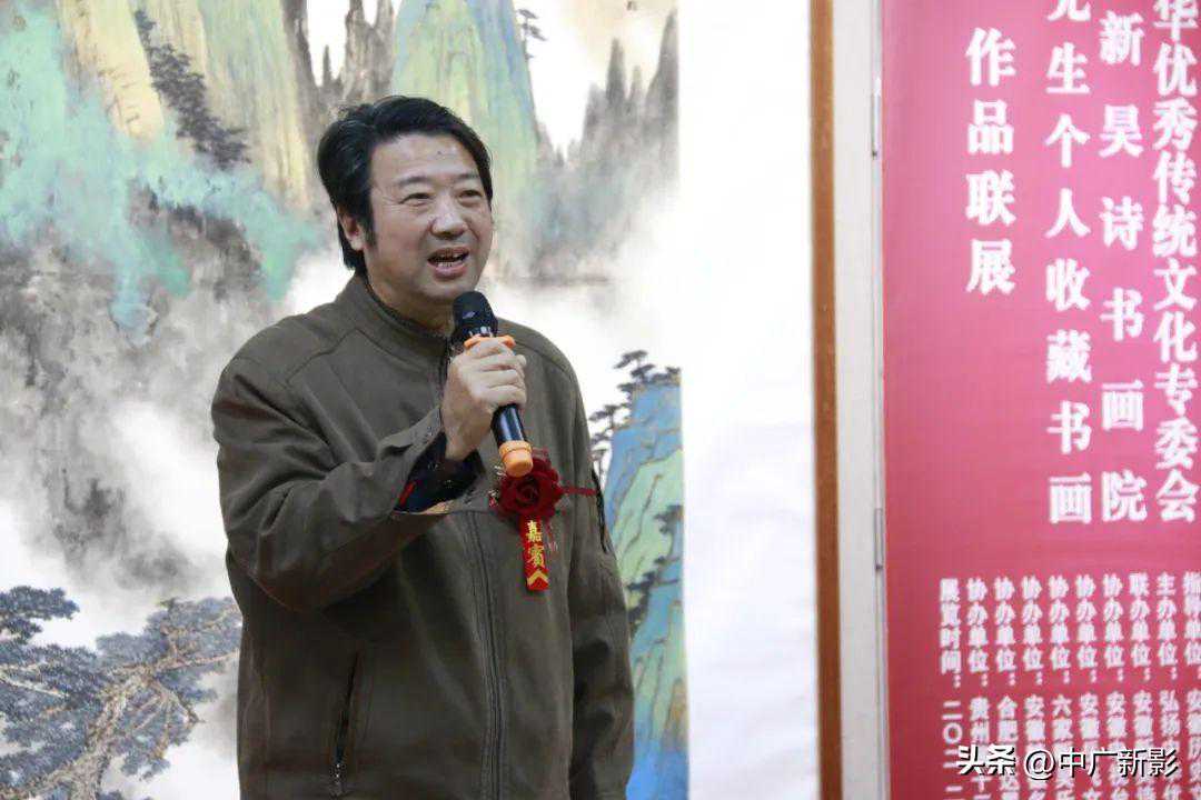 安徽历史文化研究中心副主任李贵洪;原安徽省政协委员、法制委员会主任、著名书法家胡章珮;安徽历史文化研究中心研究员、弘扬中华优秀传统文化专委会主任阿凡;安徽新昊诗书画院院长曹怀玉;安徽省文史馆特约研究员、弘扬中华优秀传统文化专委会执行主任孙辉;弘扬中华优秀传统文化专委会副主任、安徽岳飞文化馆馆长岳辅金;弘扬中华优秀传统文化专委会秘书长、安徽六家畈吴氏宗亲理事会副会长吴卫宏;合肥市灯谜协会会长吴家宏;合肥迅达文化投资集团董事长葛茂金;著名画家葛茂桐;著名书法家、篆刻家候鸿钧;宿州市书法家协会副主席、著名书法家黄权;宿州市书法家协会副主席尹正浩;原合肥市书法家协会副主席袁永群;国家一级美术师、著名山水画家李春染;安徽省新安书画研究会副会长、著名画家何天平;安徽潜川画院院长李其平;著名山水画家王邦定;著名书法家童树根;著名山水画家杨茂平;安徽电视台《艺术人物》栏目总导演吴斌等领导和嘉宾以及来自安徽新昊诗书画院的艺术家,新闻媒体和书画艺术爱好者共同出席开幕式并观看展览。开幕式由中国楹联协会会员、安徽省诗书画研究会理事、著名书法家王牧鹰先生主持。