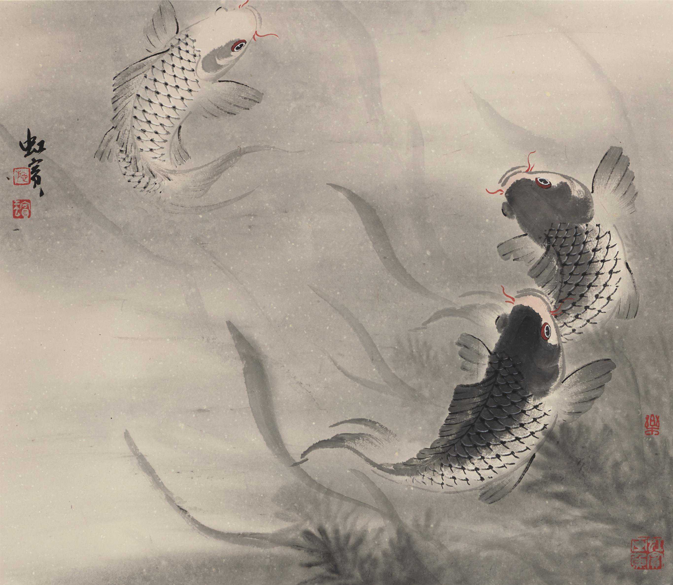 虹宾画鱼,虽然借助的是鱼,画的却是濠梁秋水,这贯穿了两千多年的一问一答,用笔墨抒发的是他内心的自由自在,画面看似是鱼乐,其实是独乐与众乐。智者往往将自身置身于物外澄怀观道,眼观口、口观鼻、鼻观心,心游万仞,悟鱼水之乐,思千载之问,冷暖自知而悠然自足。