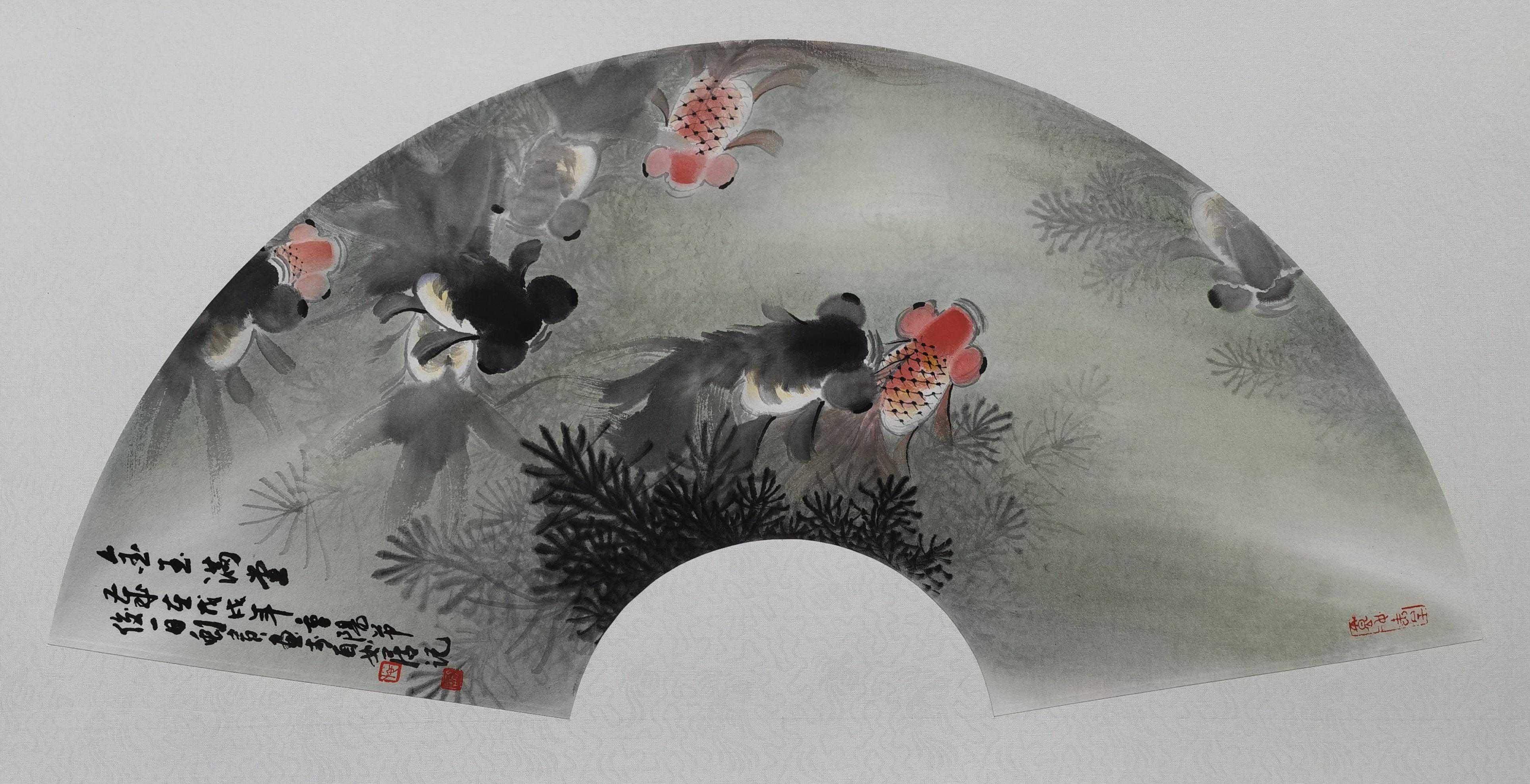 一个画家一旦能够到达笔墨写心的境界,题材和造型其实反而退居其次,变得不再那么重要了。有些人最初画山是山、画水是水,渐渐地画山不是山、画水不是水,可是到了最后返璞归真:画山还是山,画水还是水。这其间不同的境界就是提纯物象和笔墨所产生的升华。比如儿童初期的涂鸦绘画,造型自由色彩奔放,无拘无束。然而当他们逐渐长大之后,慢慢的屈从于外界的束缚而去注重技法,变成了自然万物的表现者,去模拟形似、随类赋彩,最后完成了成功模仿大自然的过程,也就是观鱼自乐的自觉蜕变的过程。非常可惜的是,很多有才华的人一生竟止步于此,很多画家也是停留在逼真描摹物象的阶段。而出色的画家注定就是要脱离描摹物象本来传达的信息,自觉的面对内心深处的情感,通过纯粹的笔墨来进行有意识的加工和创造,借助物象来安排笔墨,最终达到用笔墨来抒发内心情感的目的。虽然最终画面上呈现出来的还是原来那个物象,但是其中所包含的笔墨韵味和情感表达,却不是儿童那样无意识的涂鸦,而是画家有意识的将造型、构图、笔墨、色彩等转化为情感宣泄的痕迹。中国的花鸟画历来就是借物抒情充满象征和寓意的。诸如:花非花、雾非雾,却是点点离人泪。折梅寄与陇头人,聊寄江南一枝春。诸如此类,不胜枚举。多情的人们在花草鱼虫之间寄托了自身无限的伤春悲秋、爱恨哀怨以及相思愁苦、离别意浓、聚合欢愉……,借助草虫花鸟来比兴,含蓄曲折地抒发了大家对美好生活的希望和寄托。这才是花鸟画的本来面目和其中所包含的愁绪诗思。施生则选择将自己愉悦的心情借助鱼乐投射到笔墨中,通过他的鱼乐图再传达给众人。智者乐水,水中游鱼寄情思,涵哲理。理解了这个一点,让我们回过头再来细观他的鱼乐图,会体悟到另外一个境界:原来这正如惠子和庄生的濠梁之辩。