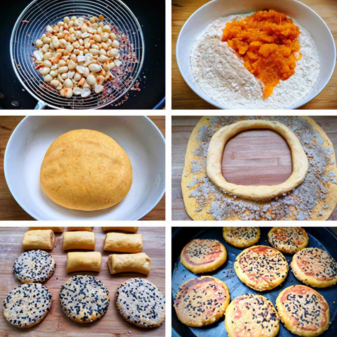 食材:南瓜1块、花生米1小碗、面粉300克、酵母4克、黑白芝麻适量,食用油2小勺、椒盐适量。