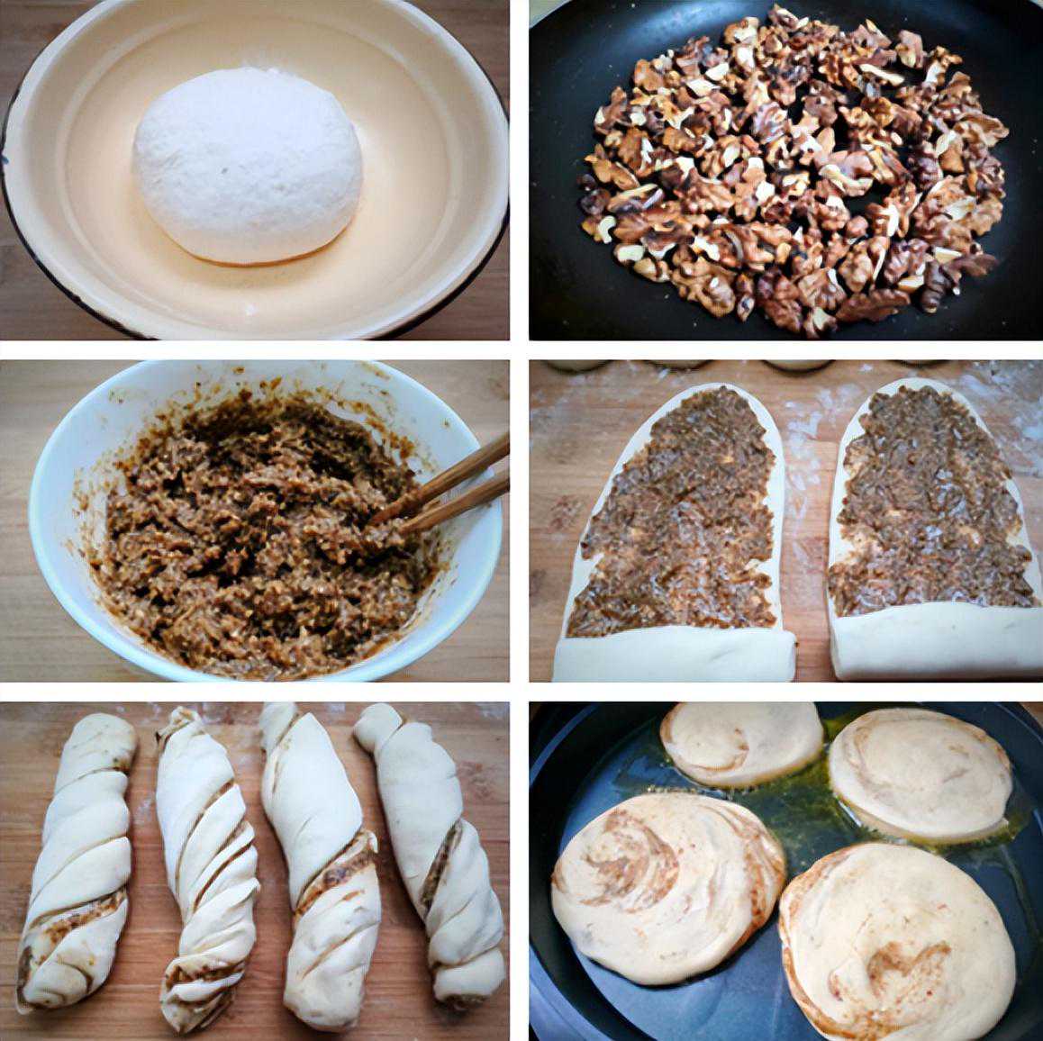 食材:面粉400克、温水220毫升左右、酵母5克、核桃仁1小盘、五香粉适量、盐适量、熟油适量。