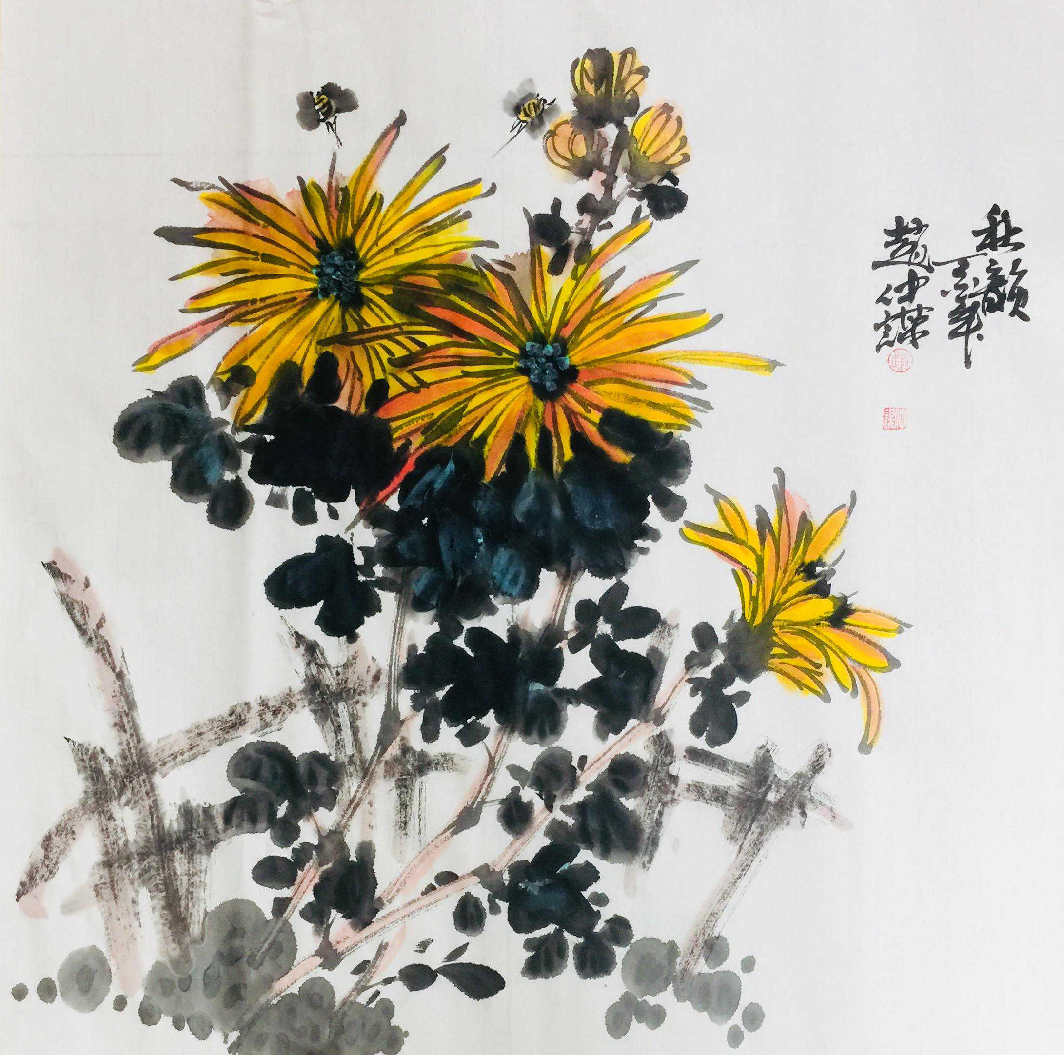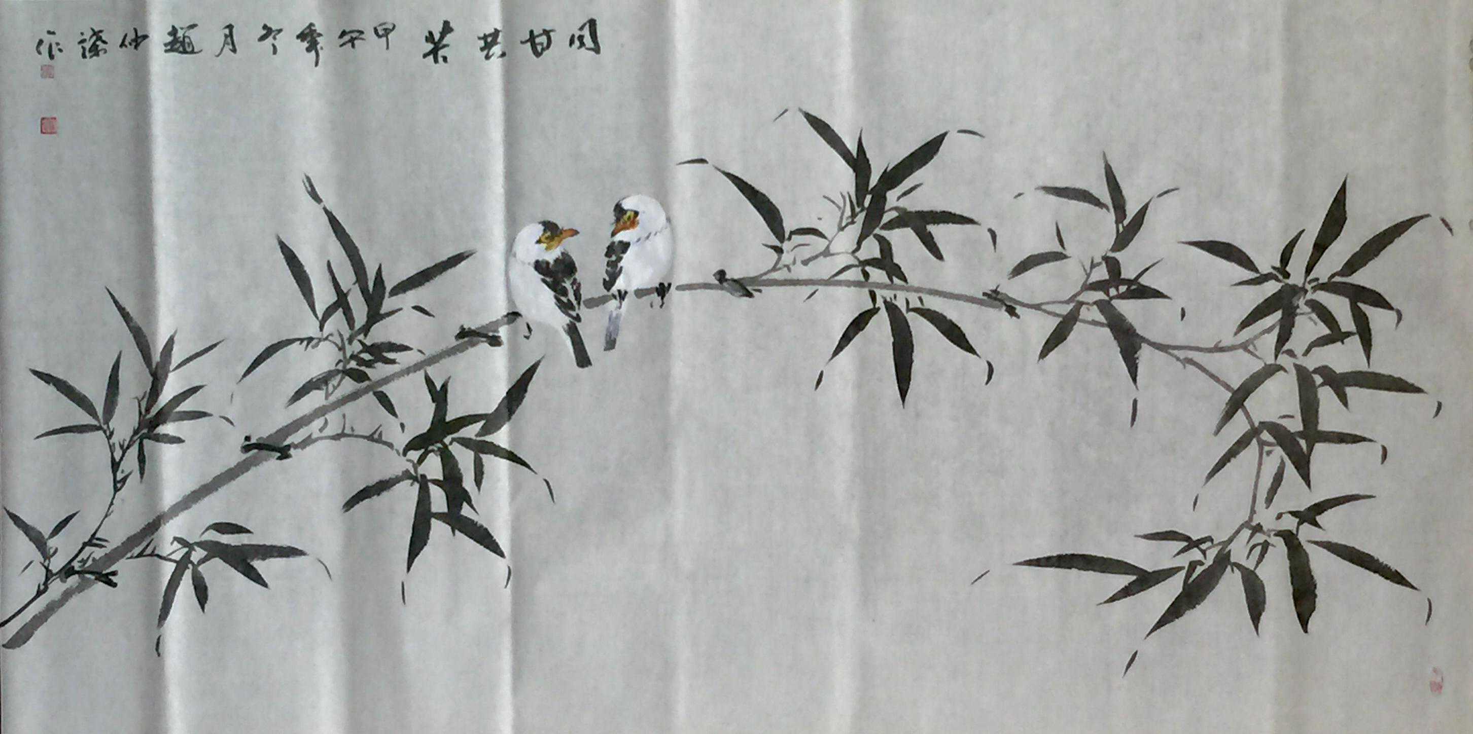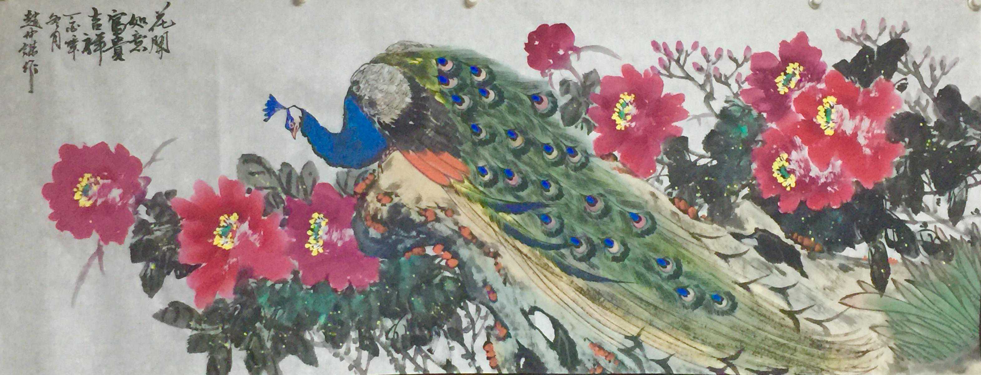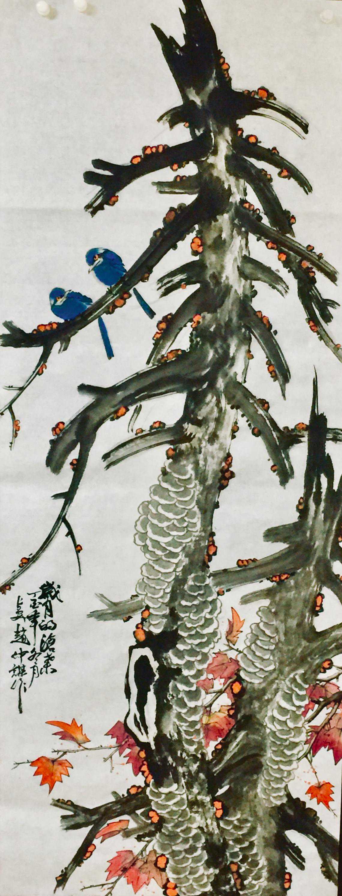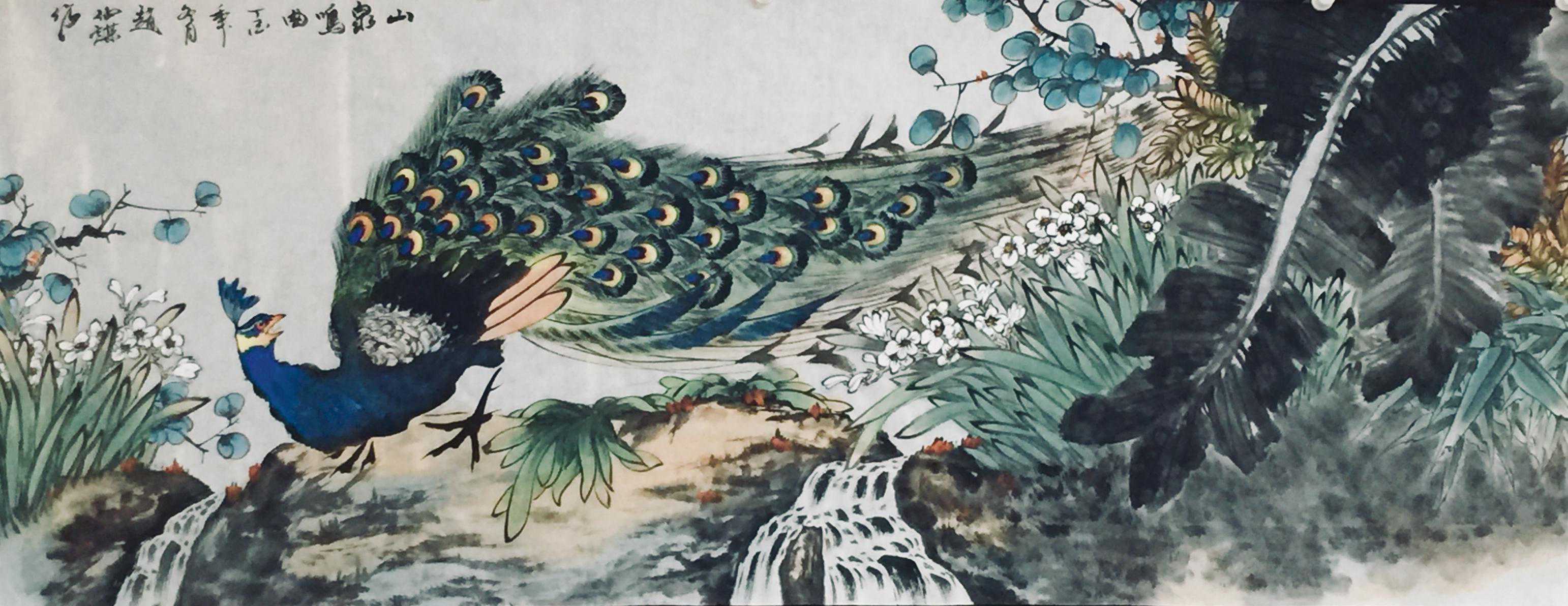 赵仲谋在写好书法艺术的同时,经过西安美院、清华大学美术学院高研班的进修,对花鸟画尤其山水画有了飞跃的进步,在他的画室看到了许多巨幅花鸟、山水创作作品。因在长期的探索与写生和进修的理论指导下,逐渐找到了一种属于自己的绘画语言,这种语言是新颖的,是建立在大写意与工笔花鸟上寓于表现力的,是通过艺术的整合提炼而成的。他将典雅与自然、飘逸与沉稳、简洁与繁杂、严谨与率意十分巧妙地融合于一体,在意与象、形与神、色与墨、收与放、紧与松等意境之间化增与减的调试,以求达到最佳的画面效果。所以,赵仲谋的作品具有双重审美特征,既有西方绘画重视光、影、色的一面,又有东方绘画突出意、情、神、趣的一面。或者说作品的形式更趋近于西方,但其神韵则是东方式的。赵仲谋花鸟画的更大突破,正在于一改纤巧之风,大胆立意、浓墨重彩,将浓重绵密的山水用墨实践和浑厚结实的汉唐造型技巧,进行了成功移植和运用,赋予了花鸟、山水画一种灿烂拙朴的英雄主义色彩,又不乏亲切灵动的生动情趣,令人一睹为快,为之震撼。赵仲谋的作品具有现代潜质的绘画色彩,那是他在首都清华美院高级研修班修成正果的再现,也是从理论到实践,在绘画作品中颇有现代审美意趣的线、色、墨、水的有机融合,是具有抽象精神的民间美术样式,那些饱满充盈、富有张力的画面,都暗含着他对现代人文精神的理解,在现代审美意境的转换上赵仲谋无疑有更高的代表性。