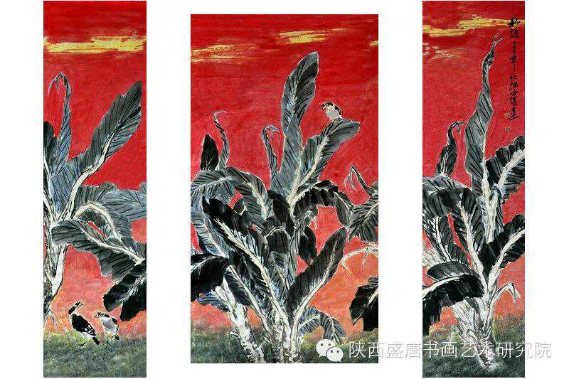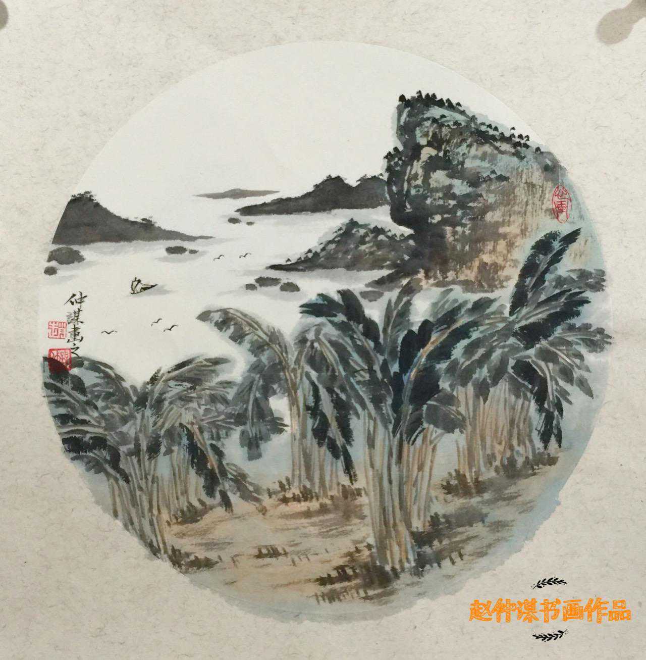 赵仲谋的海南写生椰林、海鸥、海水、蓝天以及在秦岭终南写生后画的四季山水画,都是他着力捕捉大感觉、书写大印象、把握大格调、营造大境界,追求单纯洗练,整体大气的视觉效果,展现出一种或博大、或雄浑、或幽冥、或静谧的意境,既朦胧幻化,又大气磅礴,点与线、色与墨、光与影体现了一种阳刚之气与阴柔之美,并以如椽大笔演奏花鸟、山水世界和现代人之间的虚静和律动、冲撞与静美的交响乐章。其力图以一种博大的宇宙精神、神秘的玄学色彩和永恒的禅学意味,使花鸟、山水画艺术达到一种至高的审美境地和效果。当然,赵仲谋更多的是用花鸟代言、山水抒情言志的一种文化符号,表现飞速发展的社会以及奋发向上的时代精神。