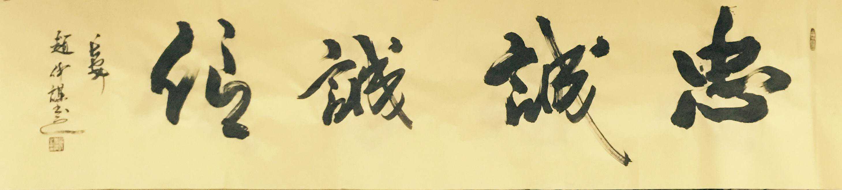 赵仲谋先生的书画艺术经名家指点,日趋成熟。他的书法结构严谨,自然洒脱,风格大胆,章法新颖。他总能把“虚与实、动与静、拙与巧、简与繁、黑与白、浓与淡都能很好的融合,表现在同一天地里。他的作品多变,功力扎实。其行草气韵酣畅、挥洒自如、放而不纵、收而不拘”;隶属淳朴厚实却神采飞扬。所有作品,静神观赏。和谐、优美、宁静,使人感到他的结字、用笔、章法、造型上沿袭了古韵,但更多的是现代的气息和时代风格。