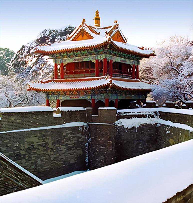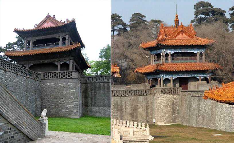 方城四角各有一座二层重檐歇山式角楼。方城与外围的风水墙形成了内城外的格局,城堡全部采用砖石砌筑而成,将隆恩殿竺主体建筑围在中央,起到了防御作用。