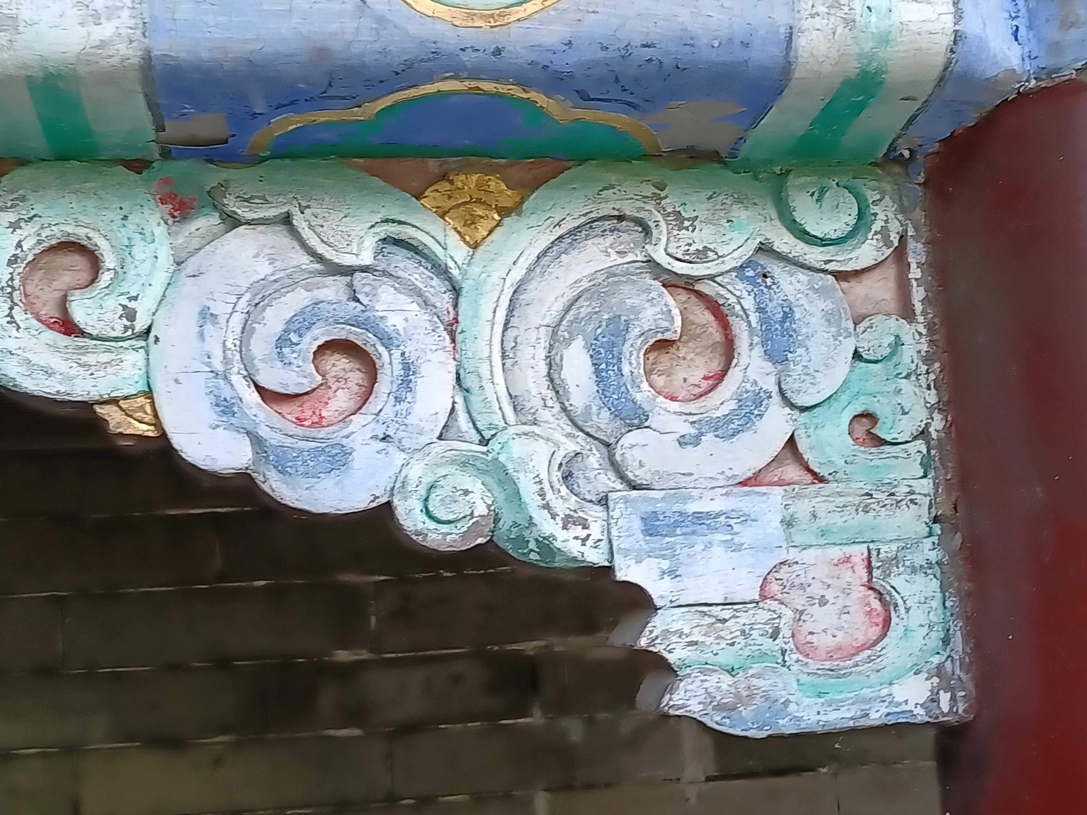 外檐彩画为烟琢墨石碾玉旋子彩画,旋眼、板花心、角地用金、大线一波----折内扣外折式。一重檐明间找头为一整两破加一路,枋心绘蓝底沥粉帖金二龙戏珠,带晕色死箍头,活盒子内绘绿底沥粉帖降龙。次间额枋找头勾丝咬,枋心内绘青地团花卷草,平板枋绘半拉瓢卡池子斗栱与栀花对位,正中池子绘卷草,两侧依次为白活风景、锦纹、草龙、白活鲜花。二重檐明间额枋心与一重檐所绘相同,盒子内草降龙。次间额枋仅有枋心,枋心内绘缠技西番莲。平板枋正中池子绘锦纹。两侧依次为草龙、白描风景、锦纹绘整旋花,斗栱为烟琢墨。栱垫板上火焰三宝珠。方寿字檐椽椽头,万字飞椽。老角梁直线退晕,子角梁肚弦退晕。