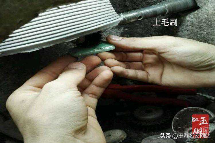 半手工翡翠抛光是指一些翡翠饰品在经过震机震过之后有些地方还不能抛磨到位,所以需要手工翡翠抛光的方式抛来精细抛磨。具体方法在全手工翡翠抛光部分一起讲解,半手工一般用在质地一般或是雕工一般的翡翠上,而雕工精细、质地优良的翡翠则会采用全手工抛磨的方法,