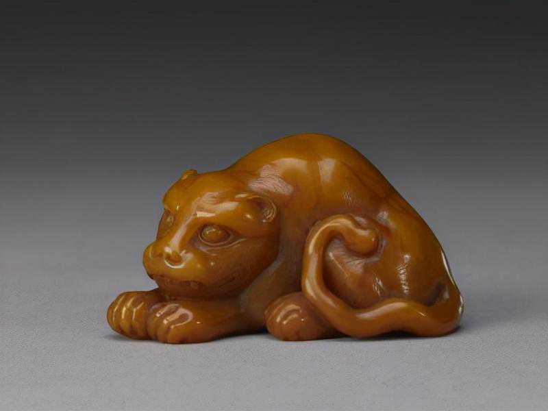 田黄石卧虎,清,杨玉璇雕刻,通高3.6cm,长6.7cm,宽3.5cm。