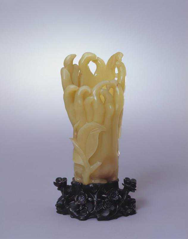 黄玉佛手花插,清,高16.3cm,口径8.2×4.5cm,足径5.2×5cm。