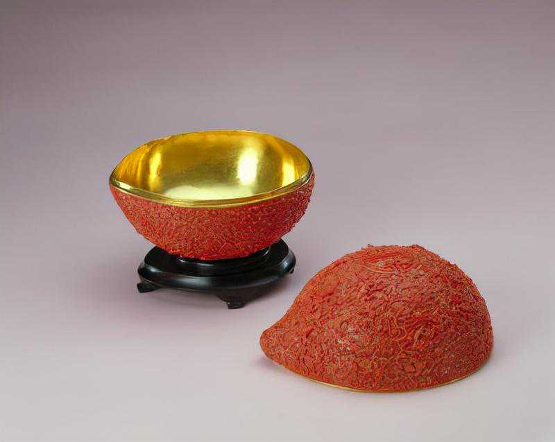 此盒造型生动,金胎外面的珊瑚系由多块珊瑚粘接而成,严丝合缝,毫无破绽,工艺复杂,技艺精湛,珊瑚成色上佳。此器既可做清代后妃们盛放珍宝的首饰盒,又可做精美的工艺陈设品。此盒藏有一对。