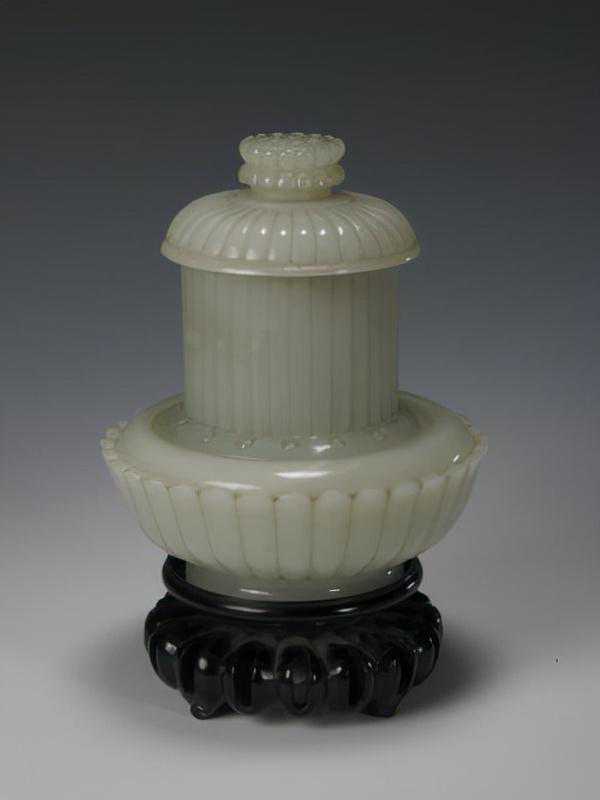 青玉莲瓣式双层奁盒,清,通高13cm,最宽11.2cm。