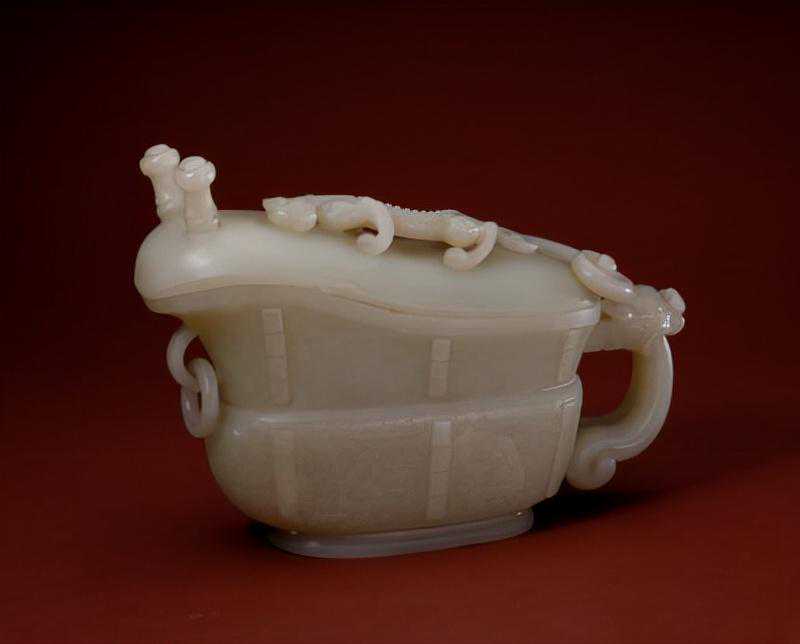 白玉龙凤云螭纹杯,清,通长13.3cm,最宽9cm,通高7.2cm。
