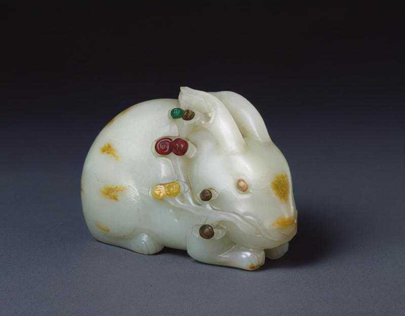 兔青玉质,局部黄沁为人工染做。玉兔呈伏卧状,四足弯曲向前,背部、双耳处有数道阴刻线刻画出毛绒质感,口衔灵芝,更显玉兔之温顺可爱。玉兔嵌有红宝、碧玺等彩色宝石八颗,颜色明艳洁净,从青玉的底色中透出闪闪的斑斓,赋予玉兔灵动之感。此兔造型圆润,雕工洗练,具有鲜明的时代气息。