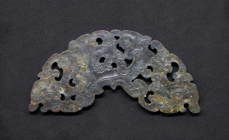 碧玉镂雕夔龙璜,清,长14.8cm,宽5.2cm,捐献自章乃器。