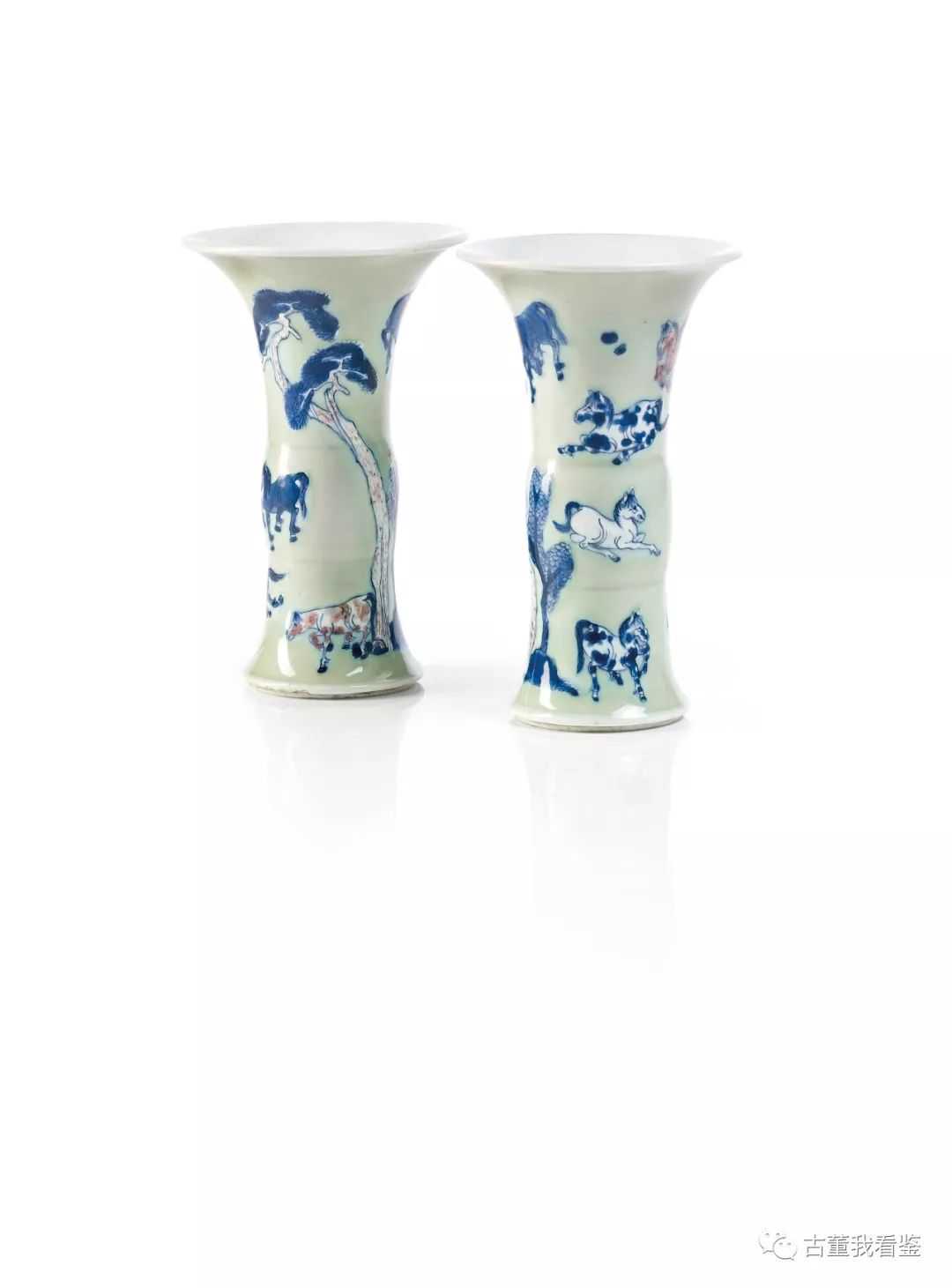 清十八世紀青釉青花釉里红八骏图小花觚一对