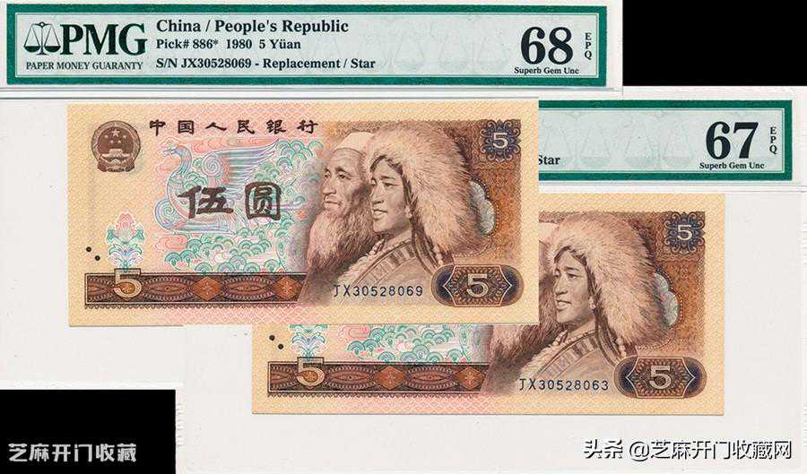 3:1980年中国人民银行伍圆,JX补版票两枚67、68高评,成交价格:HKD1180