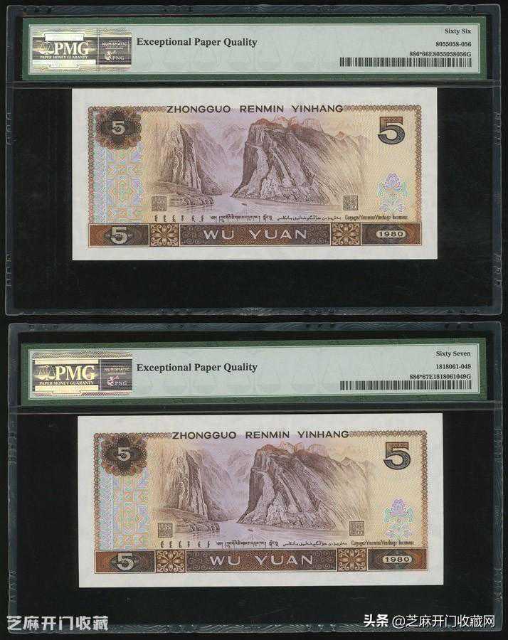 2:1980年四版人民币5元,编号QO68946641,钞票左边大幅漏墨错体,PMG66EPQ,成交:HKD1200