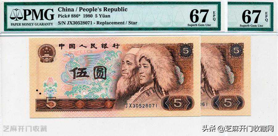 4:1980年中国人民银行第四版人民币补版5元3枚,分别评PMG66EPQ,67EPQ及67EPQ,成交HKD1200