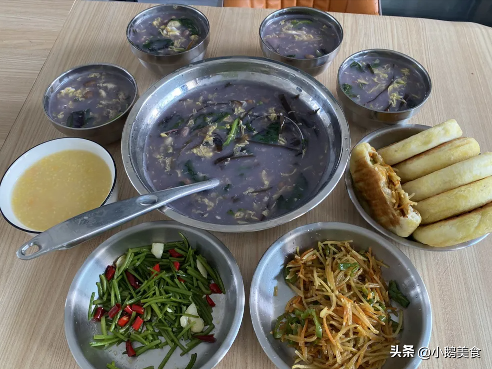 有饼有汤了,一顿操作的河南饭就搞定了。菜也就没有准备。一盘是早上剩的炒红薯梗,还有一盘是土豆丝馅饼剩的馅。早上剩的玉米糁稀饭也端上来了。都是土里刨食的农民,深知粮食来之不易,日常吃饭,主打的就是不浪费,一顿吃不完的,下顿接着吃就行。
