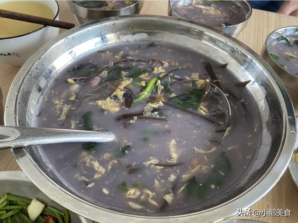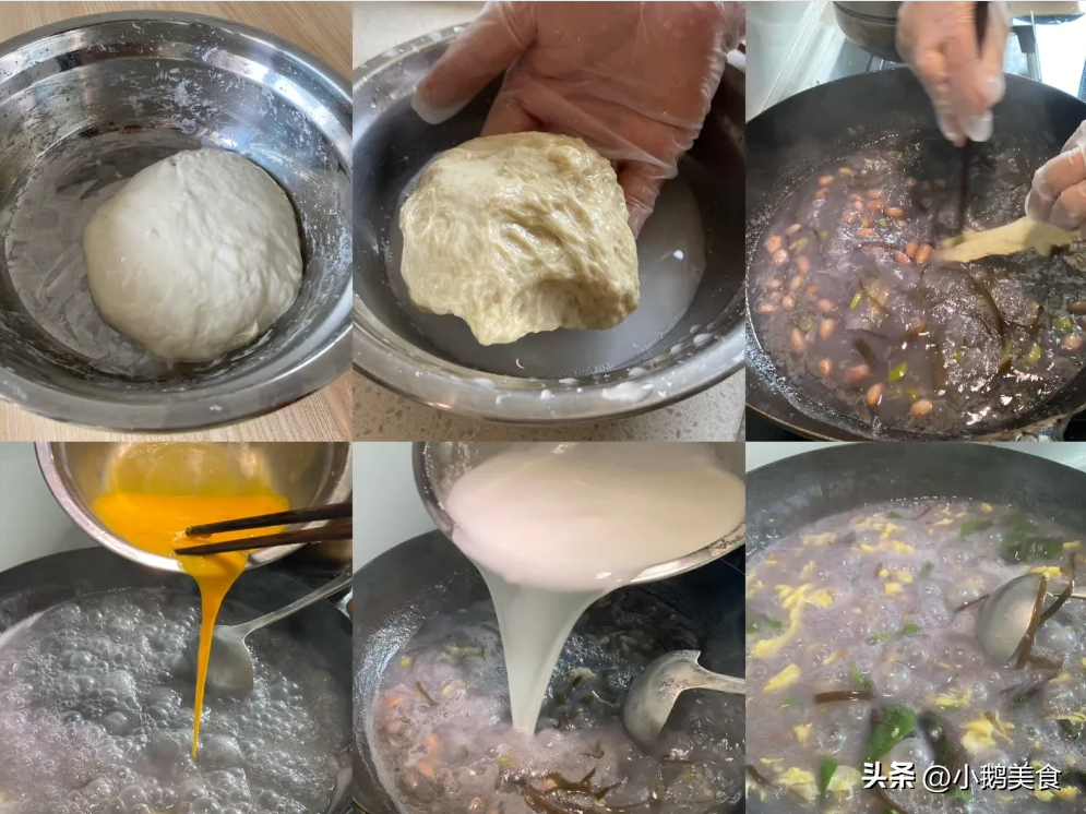 说做就做,婆婆麻利的准备食材,花生和海带还是过年从老家带回来的,用热水泡上备用。再和一团软软的面,面多揉一会揉上劲,醒上半小时,就可以洗面筋了,洗到面水比较清澈就行了。油热先放点葱白呛香,再放花生米、海带丝翻炒几下,根据家人饭量加上清水,水开后煮个5分钟,把花生和海带煮熟。一手拿着面筋,一手用筷子戳着面筋,把面筋搅碎,淋上蛋液,再慢慢倒入适量洗面筋的水,煮到适合的浓度就不用再倒了。出锅前放苋菜,加点盐、胡椒粉、五香粉、香油,搅拌均匀就搞定了。