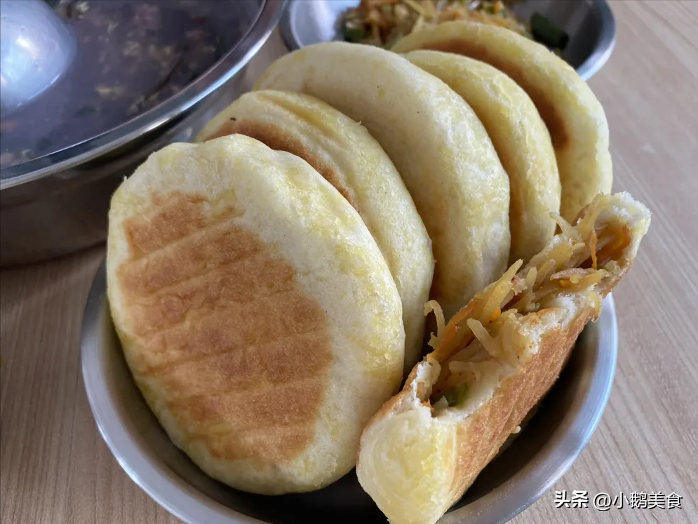 面筋汤有了,还得有主食。家里的馒头吃完了,还没来得及蒸。给婆婆刚说过想喝面筋汤,我就赶紧去和了一盆面,又根据家里现有的食材准备馅料。油热呛香大葱白,放入青椒丝炒香,再放土豆胡萝卜丝炒软,加盐、五香粉、生抽,拌匀放凉即可。面发好后,排排气,分成小剂,包上馅料,按成饼子,中火烙到两面金黄,按压可以回弹就熟透了。饼皮酥脆柔软,馅料香辣开胃,可好吃了,我一共做了10个饼,我老公自己就吃了5个,就连我家2岁多的孩子都吃了大半个呢。