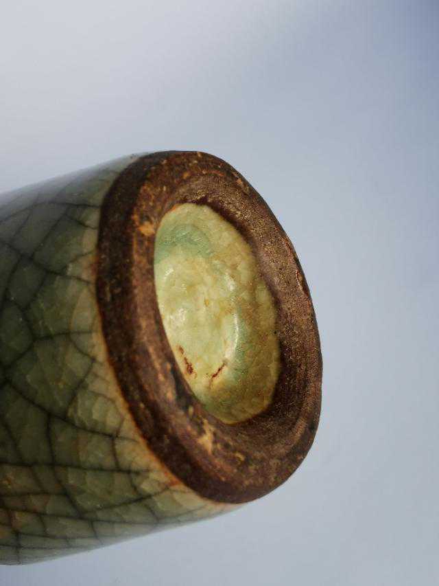 胎质坚致呈土褐色,口沿酱釉似紫口,乃清中精仿官釉紫口铁足。