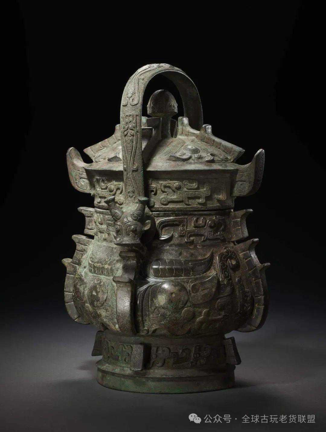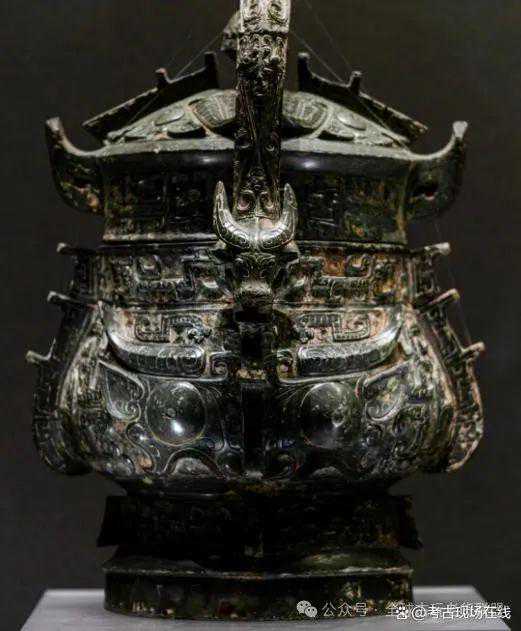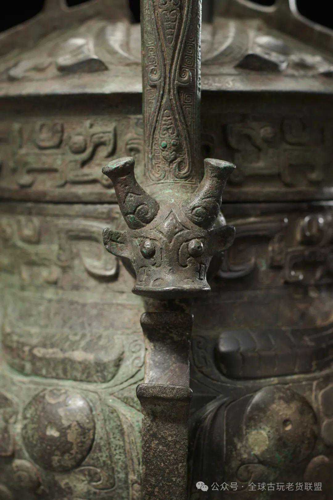 此件青铜卣平面椭圆,体型高挑硕大。盖部顶有圆形抓钮,盖面隆起,折沿直壁。盖与器子母口套合,器内有榫口,自颈以下逐渐宽阔,腹部垂鼓。颈部两端有半环,上套接“几”字形提梁。腹底承高圈足,上敛下侈,圈足下设增高的边条。卣装饰华丽,满工而作:盖钮呈瓜棱状,分六瓣,每瓣饰复育阶段的无翅蝉纹。盖面起四道扉棱,以长棱为鼻基、短棱为分隔线,浮雕两个牛纹。牛纹的角形似水牛角,角根横向,角尖上翘。盖壁短端出两条扉棱,长端各有一翘角,象鸟之尖喙,立面阴刻蝉纹。盖壁浮雕两组弯角鸟纹,以扉棱为界面面相对。弯角鸟纹是在鸟首后装饰一弯角,角根向下弯曲,角尖向上。