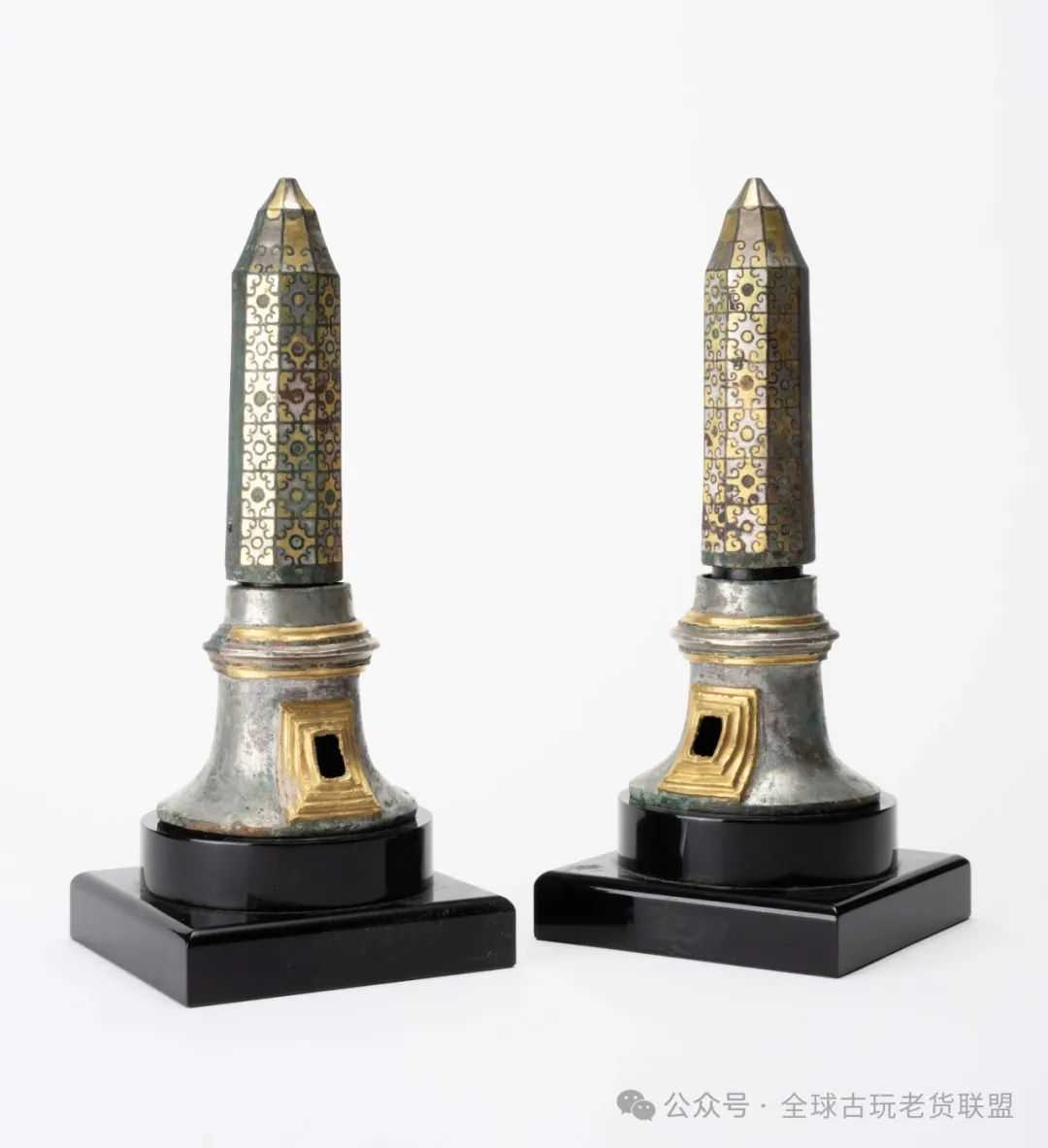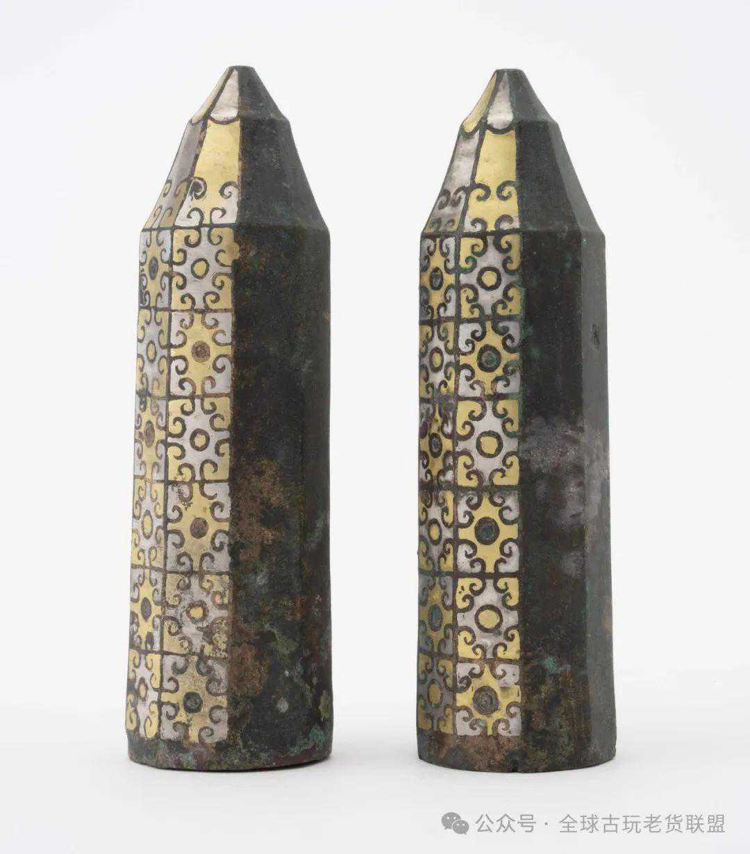 此对乃极为珍罕的軎殳,是軎和殳两种青铜构件的组合。器根部为车軎,一端细一端粗,中部凸起弦纹,粗端穿孔,用以纳辖,又称“轊”。弦纹和方孔四周错金,其余部分错银装饰。軎和辖是成对出现的车马器,軎套在车轴两端,加固轴头。形状多呈长筒形,一端粗一端细,粗端套接车轴。辖是车轴上的销子,长条形,上粗下细,顶端多有装饰,插入轴末端方孔,防止车轮脱出。