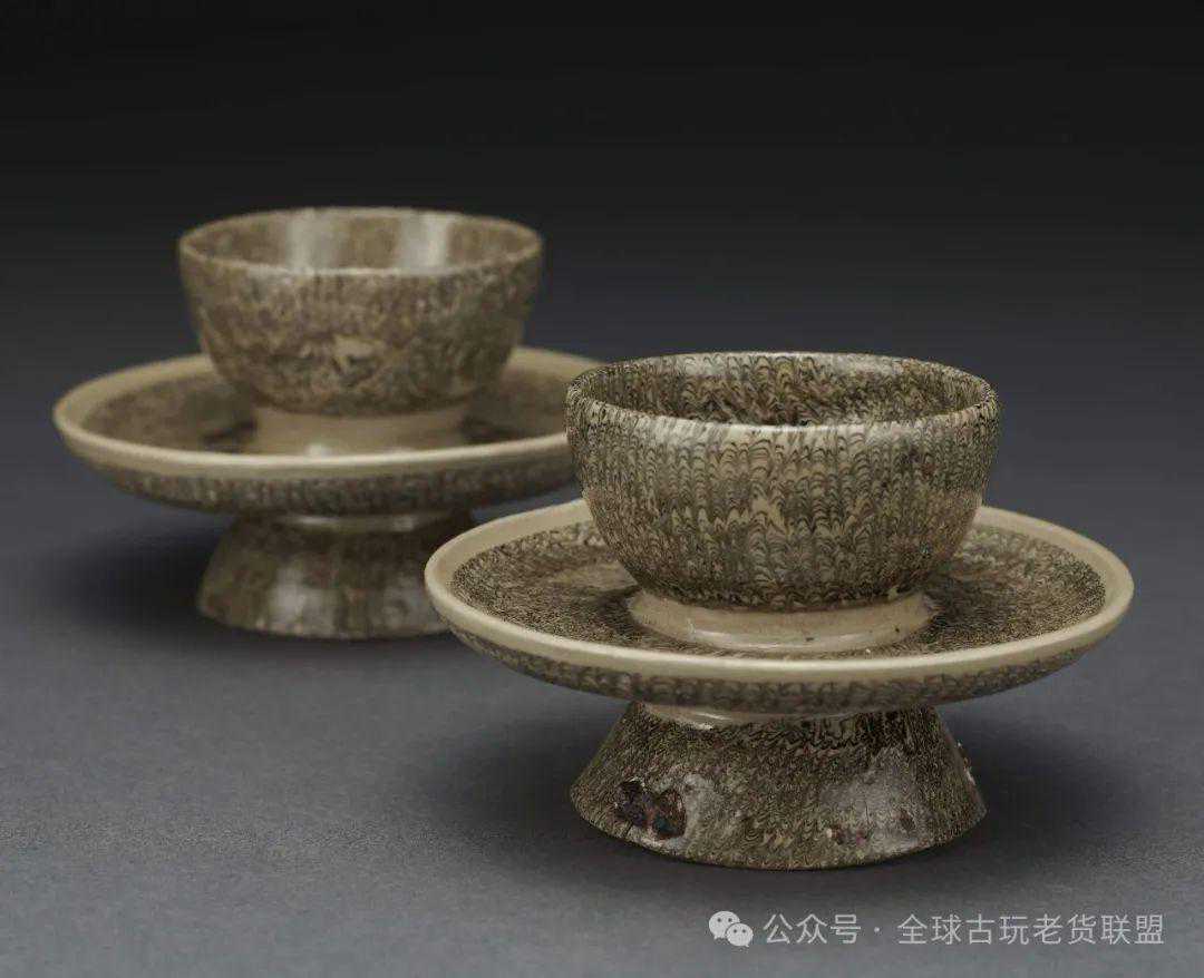 绞胎瓷是唐代开始出现的陶瓷装饰工艺新品种,北宋时期,当阳峪窑将唐代巩县窑的绞胎工艺发展到了顶峰。此对盏托即是当阳峪窑所制,形制相同,直口圆腹,收束底足与盘口相通。盘侈口浅腹,下承外撇的高圈足。除托碗束足、盘沿呈白釉外,其余满工装饰绞胎纹。部分绞胎若翎毛翅羽,条条束束,波曲交织,部分若清波水流,回旋涌动,其万千变化之态令观者赏心悦目。