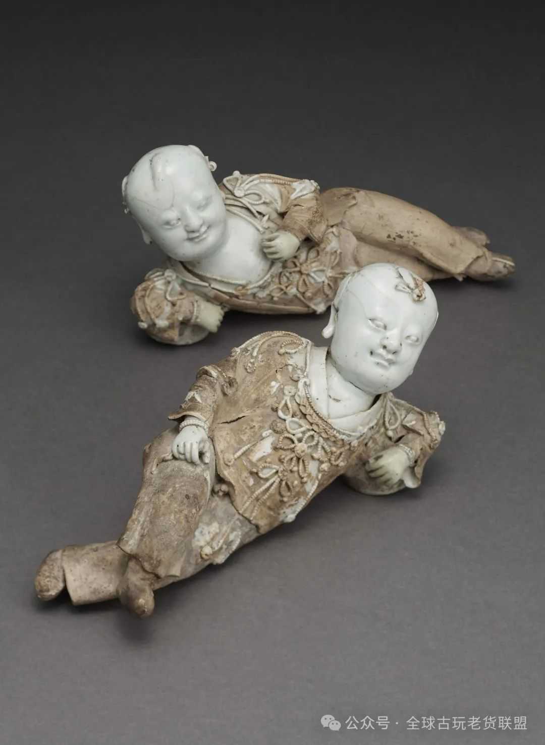 此童子一组两件,左右一对,形制相同,姿态稍异。其一童子左侧而卧,左臂蜷缩支体,两腿一收一伸,右臂轻搭右腿。另一童子右侧而卧,右臂弯曲撑地,左手拉扶衣襟,双腿微屈相迭。两童子均身着宽衣,披挂项圈璎珞,侧颈前望,双目圆睁,笑容绽放。其面容丰满圆润,头顶发髻,双耳厚实,一派恬静纯正的神态。童子的面部、胸口、双手施青白釉,塑造肌肤洁白柔嫩之态,其余露出胎骨,用以表现服饰的色泽质感。