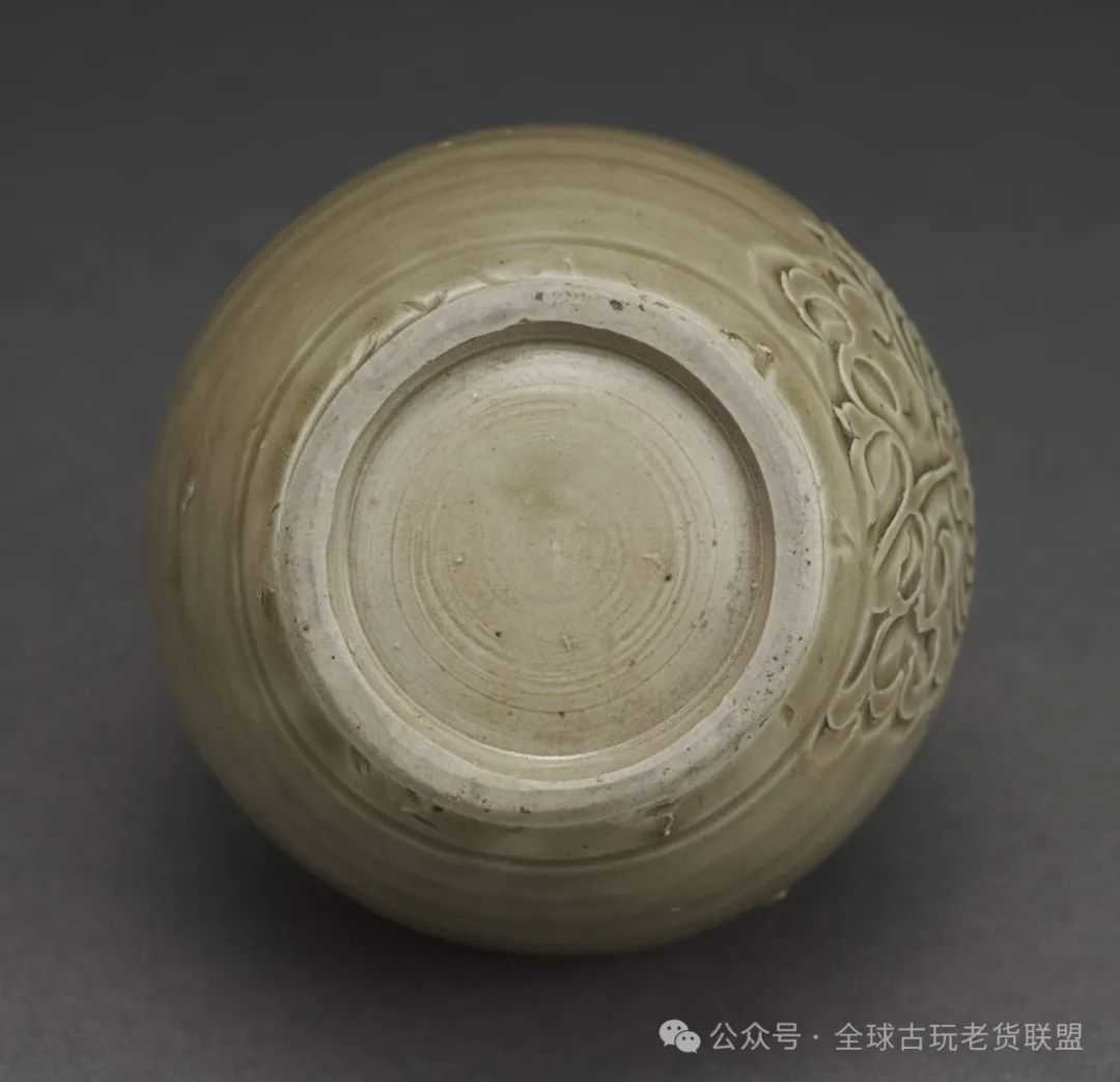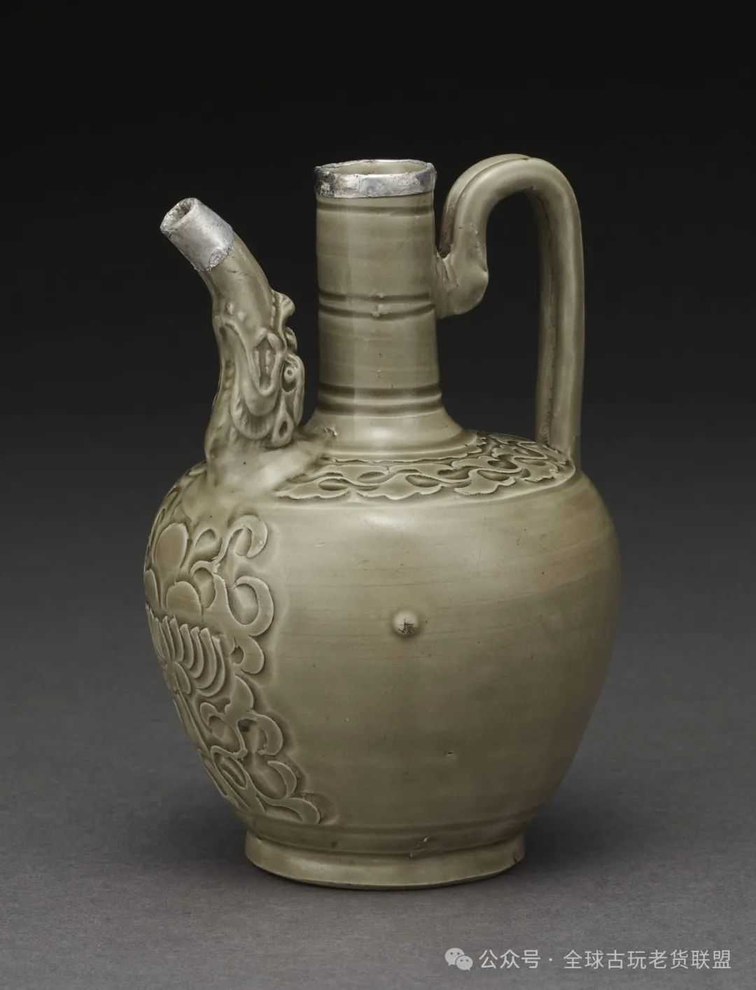 此件执壶长颈圆肩,前设长弯流,后置耳状鋬,圆鼓腹,下连外撇厚圈足。通体采用刻花工艺装饰:颈部分三段共饰五道弦纹。流口浮雕龙首,流腹交接处的腹前,剔刻一朵硕大的莲花,缠枝蔓蔓,延伸满布壶肩。壶鋬作两圆线相并,若两根莲茎。通体施青釉,绿中泛黄,刻花刀口处积釉稍厚,形成浮雕晕染的三维效果。耀州窑位于陕西省铜川市黄堡镇,创烧于唐代,成熟于五代,以青瓷闻名于世,北宋时尤以刻花技法最为主流,此件执壶正是这一时期的产物。