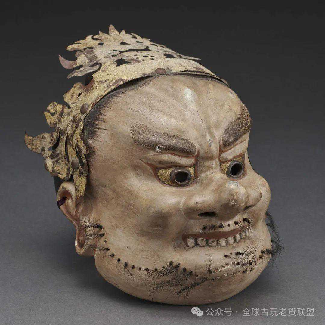 “傩”是兴起于先秦时代的驱邪逐疫、禳凶纳吉的仪式,主持者称为“方相氏”,头戴面具,手持竹竿或兵器作驱除击打瘟疫鬼祟之状。至唐代,除夕之日更要进行“大傩”的祭礼。傩仪面具形式多样,最初多鬼魅、动物,佛教的兴盛将天王力士的形象引入古老的傩祭之中。日本正仓院保留有唐代力士傩仪面具,与本件的做工、漆色相类,可为参照。