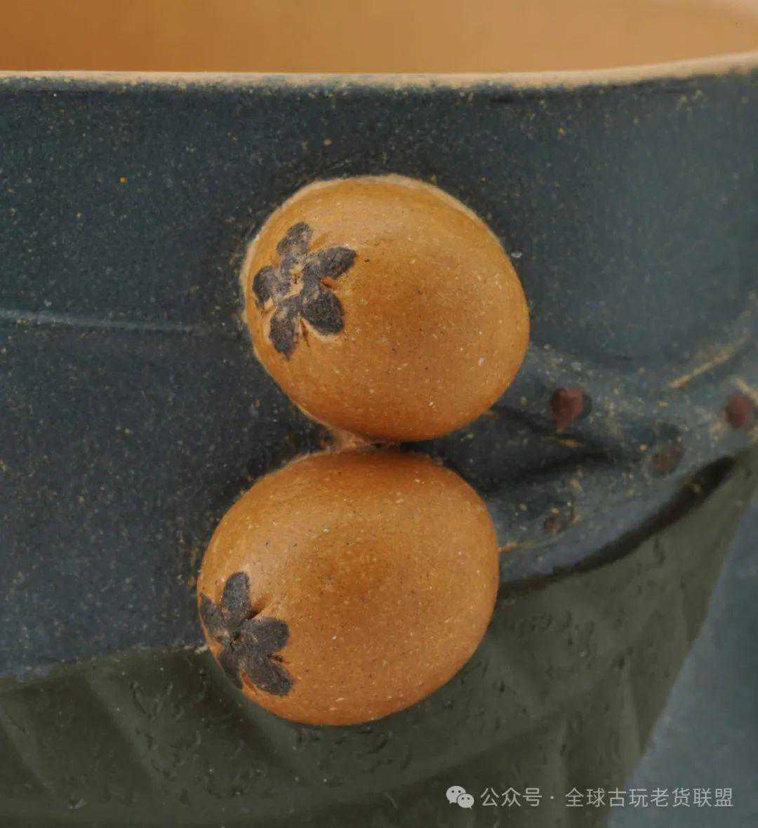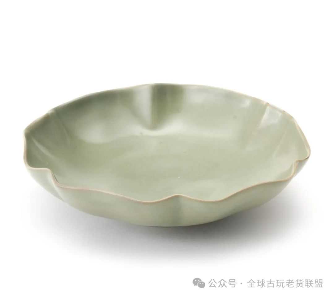 器形仿自金银器。此件敞口平折沿,弧形壁圈足。胎体致密坚实,胎土淡灰,底足露胎处见赭褐色窑红。釉色莹碧流动,呈粉青带黄绿之质,厚润如脂,温和内敛,微泛酥油光泽,乳浊感强,深得宋代官窑追求玉质感之精髓。釉面片纹大小各异,纹路清晰,纵横交错,最深为铁线,铁线之间穿插金丝。整器造型别致,是龙泉青瓷中的精品。