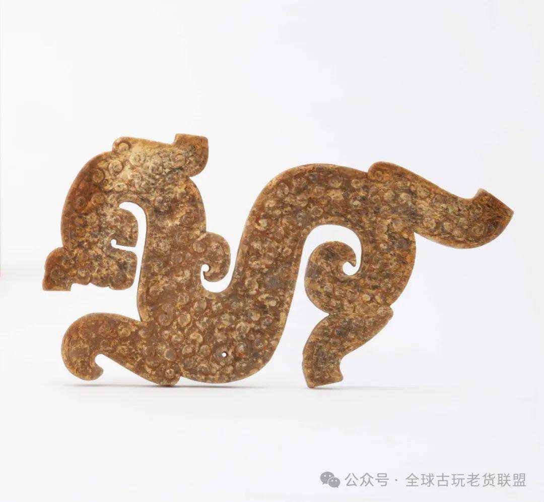 龙形佩是战国时代最具代表性的器形,造型上大致可分为独体玉龙和双首玉龙两种,其形状有璜形、玦形、螺旋形、S形、W形及翅翼形几种。本件龙形佩即独体的S形龙,身躯波曲,头部回首而望。其头部近方,颅顶角较短稍翘,通体以减地浮雕装饰谷纹,谷纹较突出,皆为战国早期流行特征。身躯一处打孔,系挂则两端平衡。