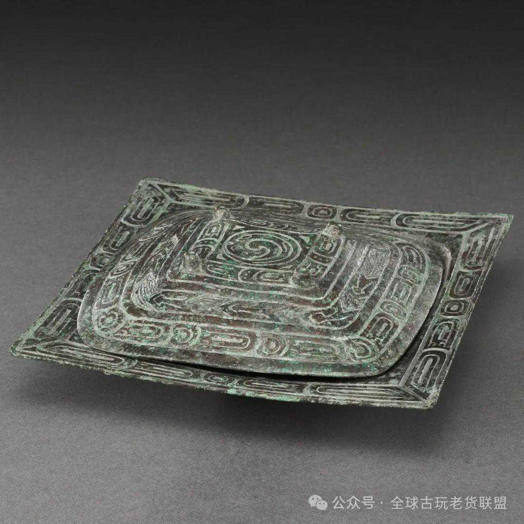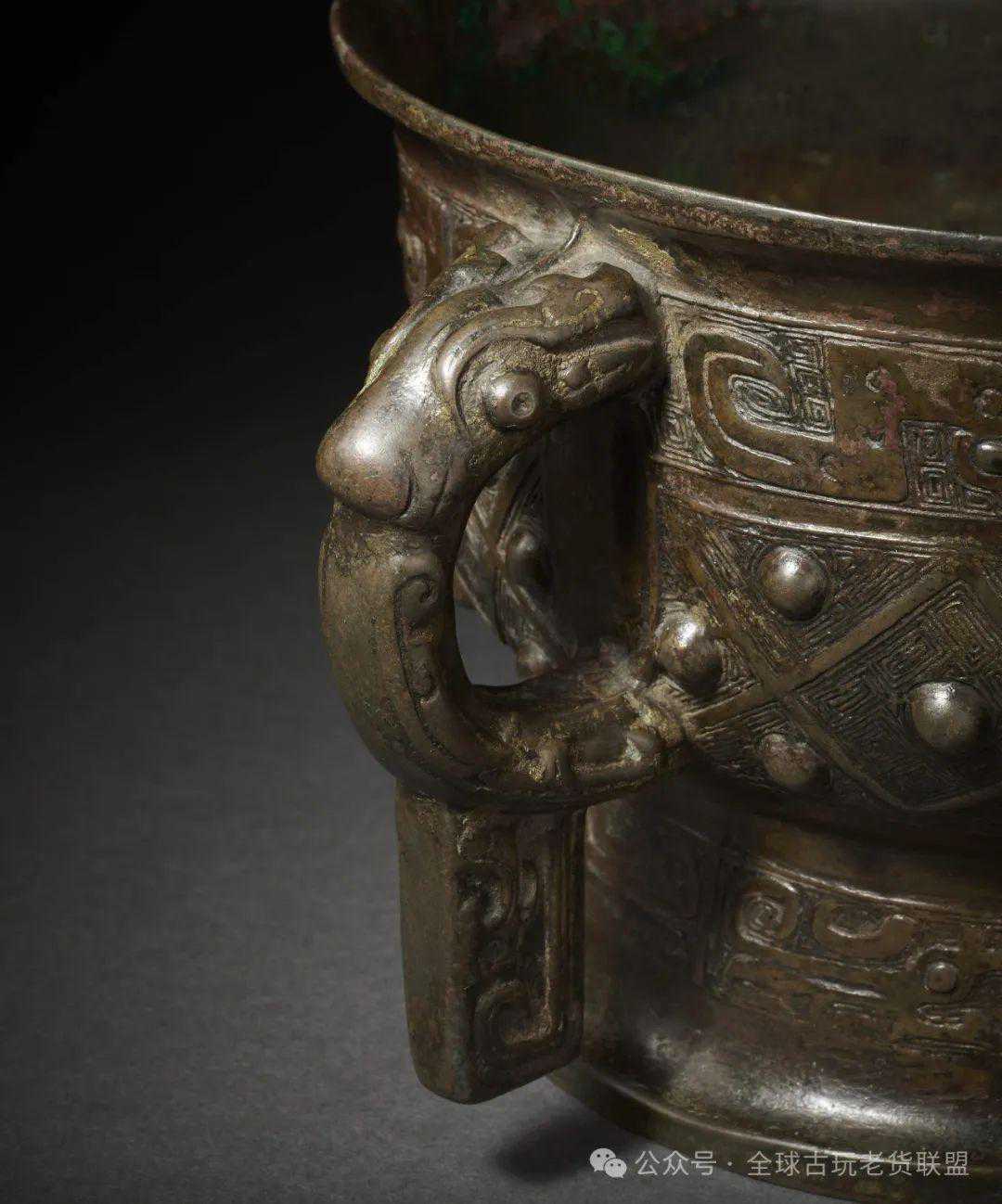 此簋为西周早期典型制式,通体褐红铜色,上布点点斑驳绿绣,是常见的晚清民国传世熟皮壳。