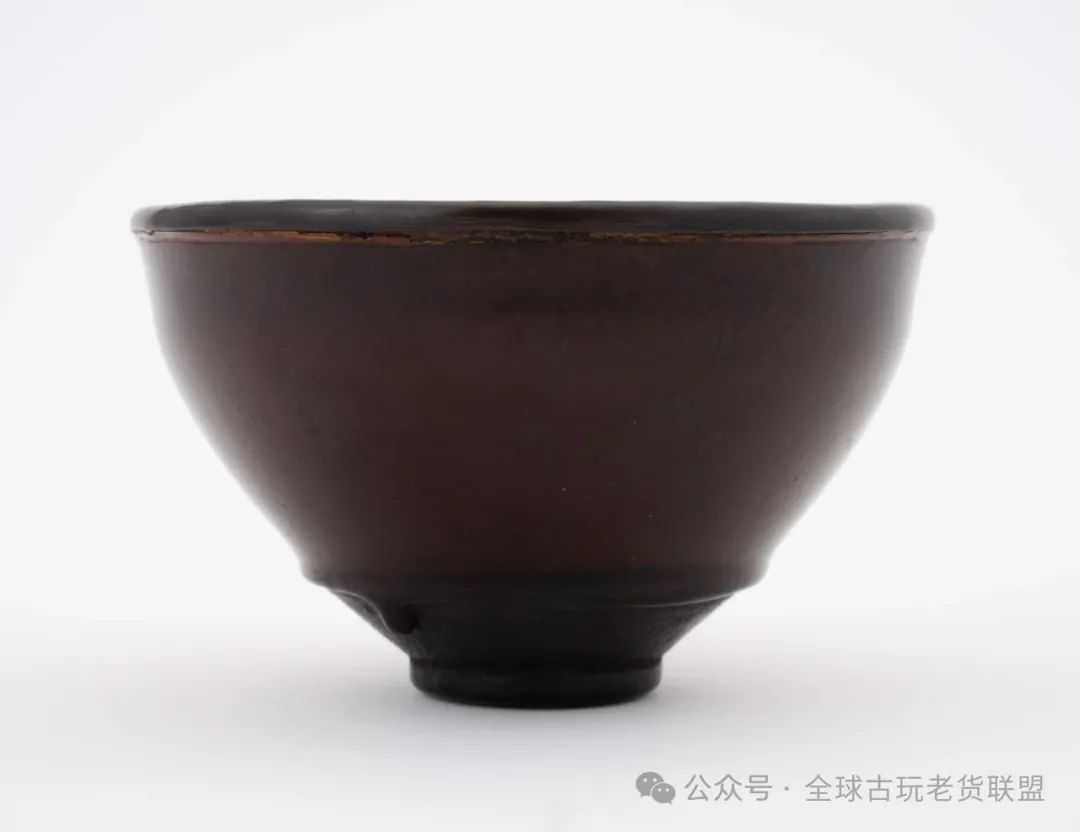 茶碗作为茶道中最重要的器具不可或缺,因为在茶会中,茶碗是惟一在主人与客人、客人与客人之间人手相传的茶道具。品茶之余,可以拿在手中端详鉴赏的也只有茶碗,相比之下,其他茶道具不具备上手把玩的条件。从古至今,在茶道中最受推崇的茶器首推天目茶盏,其贵重可见一斑。此件茶盏敛口弧壁,口微上卷,圈足外撇。或许是太珍贵的原因,盏里髹黑漆,盏外髹黑漆不到底,露胎处呈黑色,工艺精巧,别具匠心。