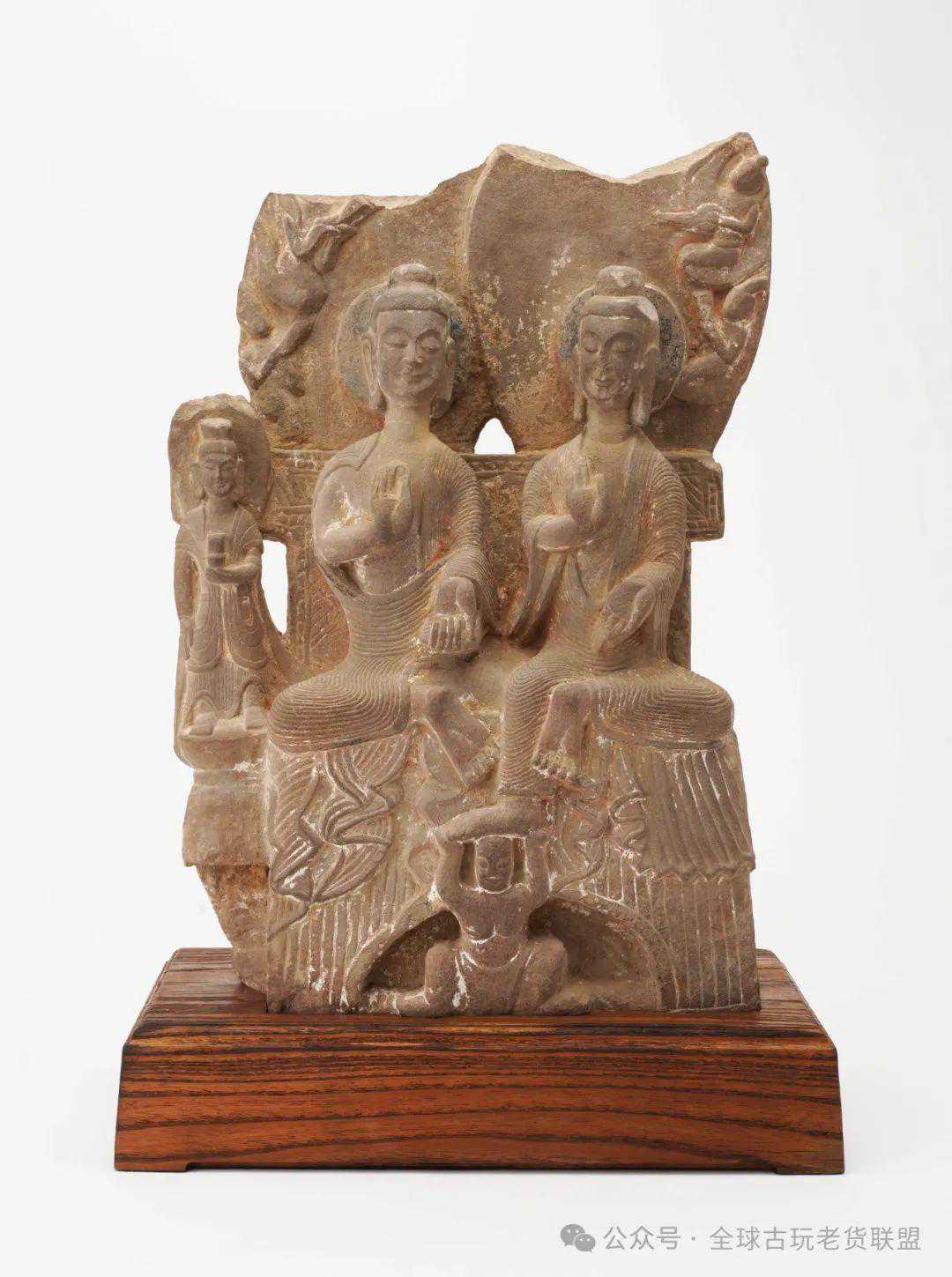 「二佛并坐」是中国佛教艺术特有的造像题材,在北魏至隋代盛极一时,以释迦、多宝二佛并坐为典型特征,源于《妙法莲华经卷四•见宝塔品》。经中记载,过去多宝佛行菩萨道时发大誓愿,若成佛、灭度之后,于十方国土有说《法华经》处,为闻是经,多宝塔必现,为作证明。当释迦佛欲说法华之际,多宝塔从地踊出,释尊分身云集,依众之请,开启塔户,多宝佛邀请释迦佛入塔,并分半座与释迦佛,「尔时,大众见二如来在七宝塔中师子座上结加跃坐」。两像头部背光,眉目清新秀气,大耳垂肩,佛右手掌心朝外,五指伸直向上施无畏印,左手施如愿印,结跏跌坐,披巾垂肩,腹前交叉穿璧,衣摆悬垂于须弥座前,独立并列,右侧佛身侧立一胁侍菩萨。整件造型古朴,刻画简饰,线条流畅自然,刀法犀利,透出智慧、慈悲、安详、高贵之气质,具有极高的艺术性。