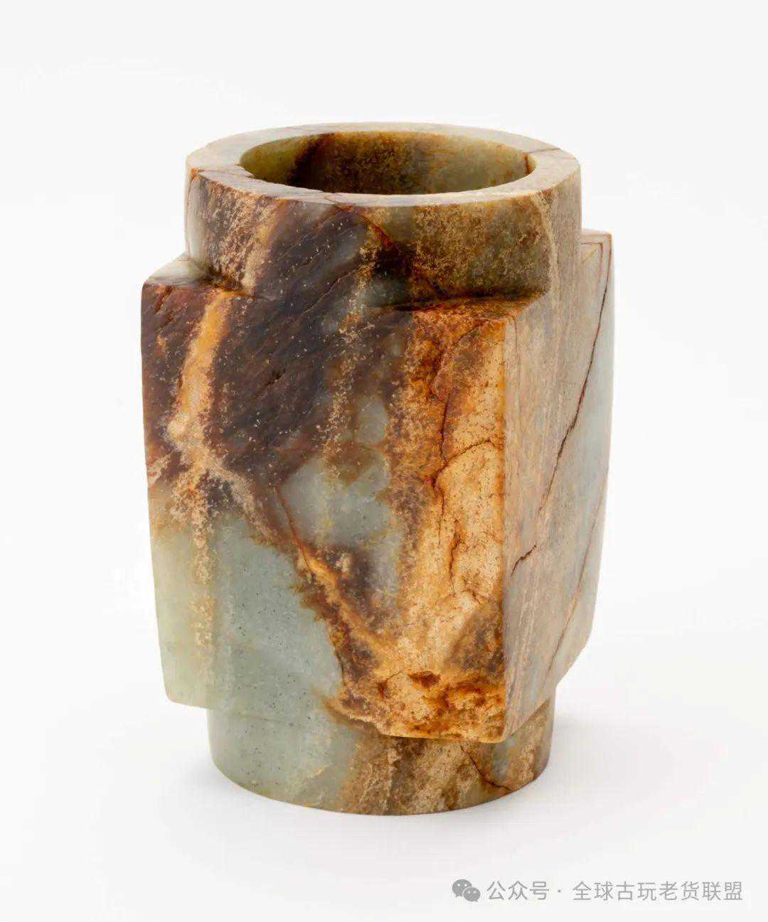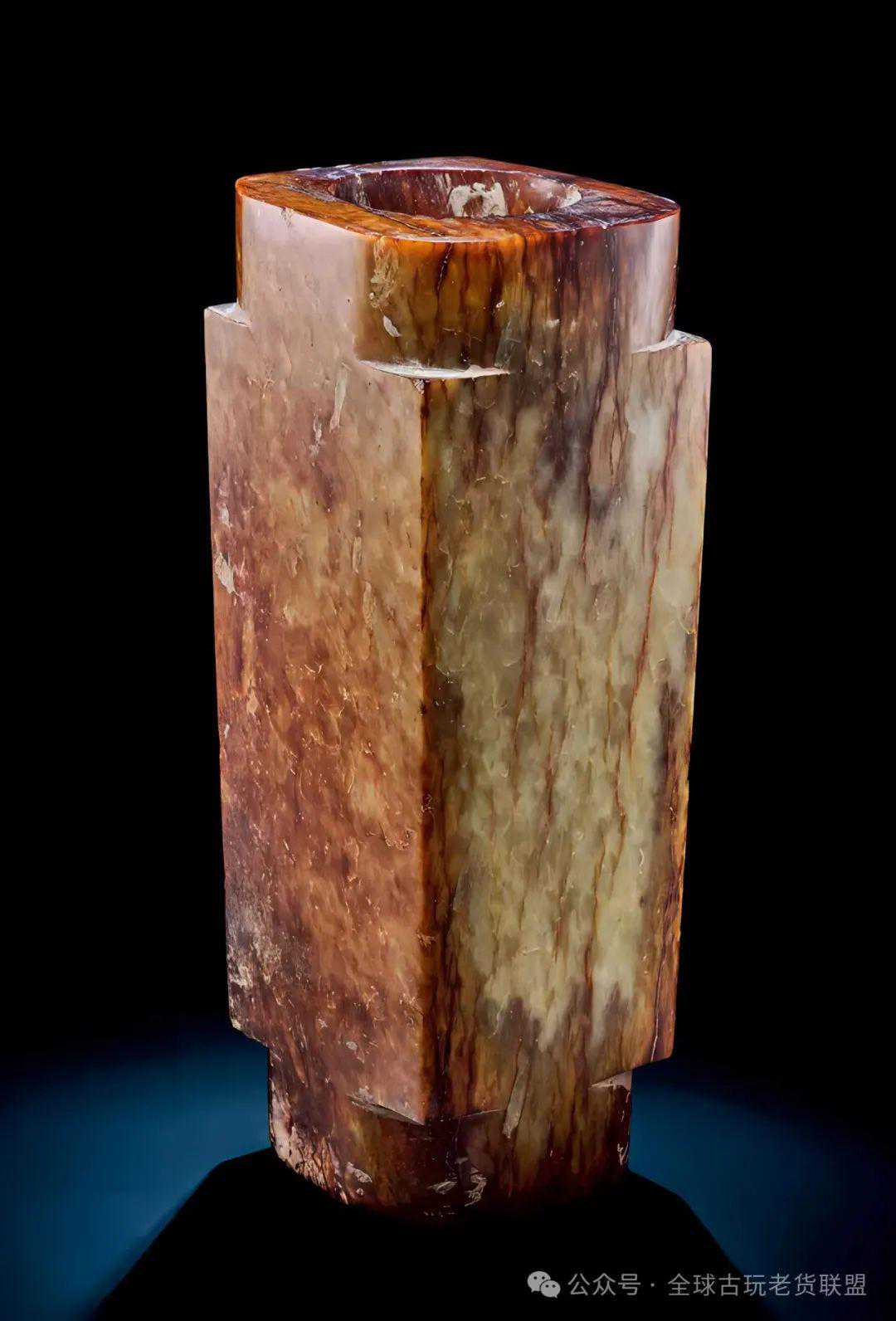 此件拍品青玉质,温润纯厚,部分钙化,局部有黄、褐色沁。琮内圆外方,两端有射,射管外壁略方,中孔圆形,孔内饰台阶痕。整器打磨抛光讲究。此玉琮工艺,体量修长,宁静沉稳,散发历史厚重感,展示出先民与神灵深度沟通之境界,应为当时至高等级的祭祀礼仪用器。